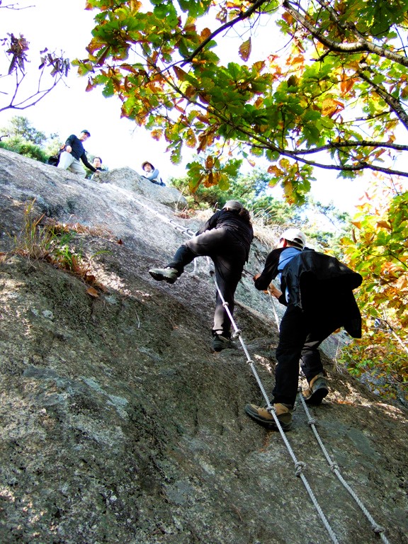 이 구간이 가파르긴 가팔라서, 젊은 날 여러 산우들과 함께 이 계단을 피해 호기롭게 계곡을 타고 올라가서 우쭐거렸던 기억 등이 흑백 필름처럼 지나간다.