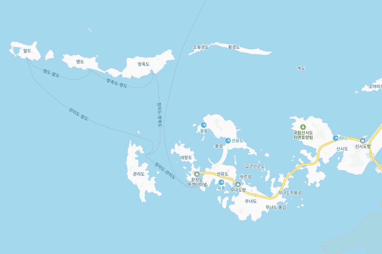 배가 섬에 가까이 갈수록 섬과 섬을 잇는 다리들이 비교적 자세히 보이는데... 말도에서 명도까지는 다리가 이어진 것으로 보이는 반면