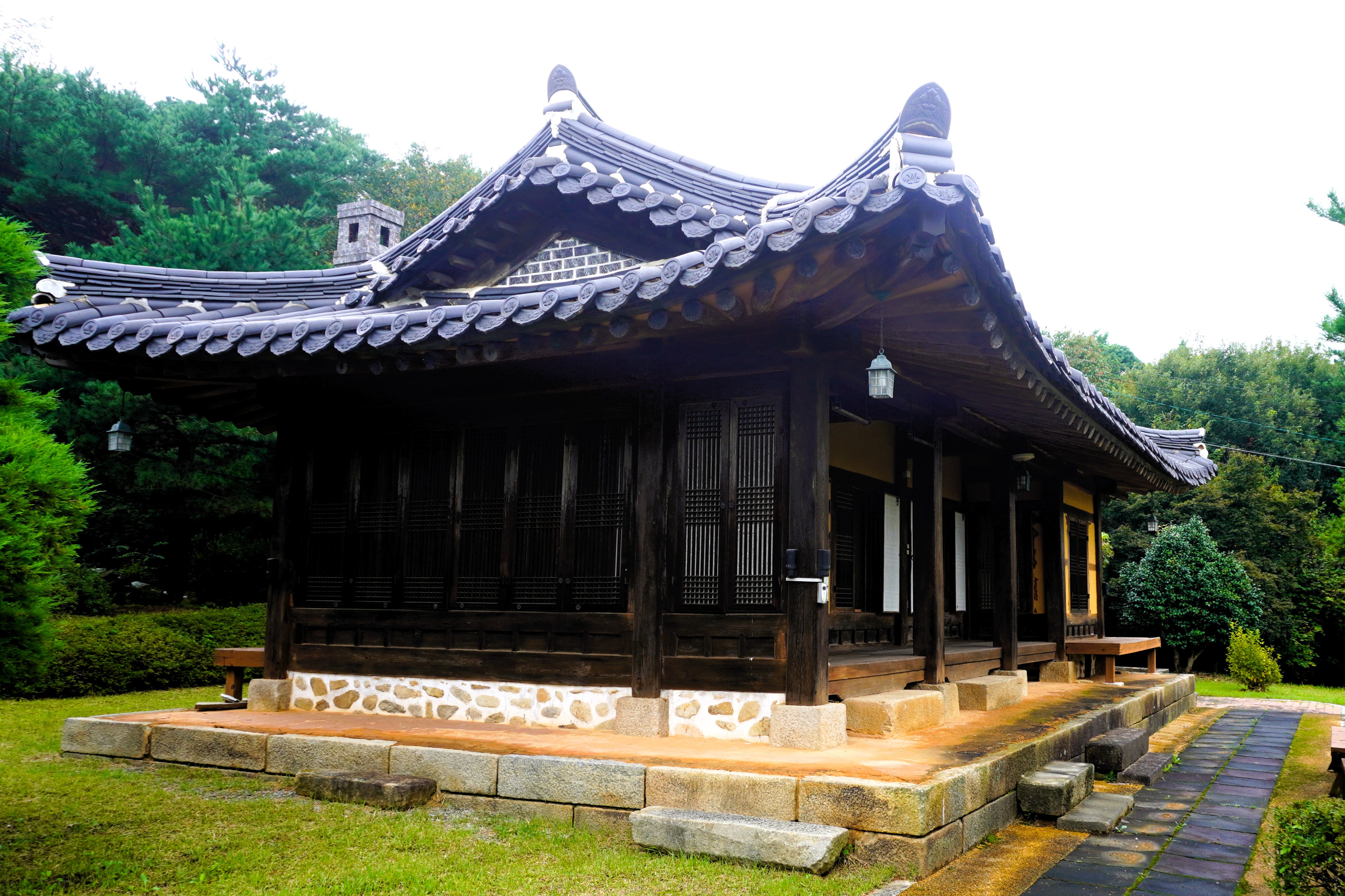한참 조성되는 홍예공원. 그 중간 아디 쯤 산자락에 있는 예술인마을에서 산으로 들어섰더니 우선 멋진 한옥이 보였다.