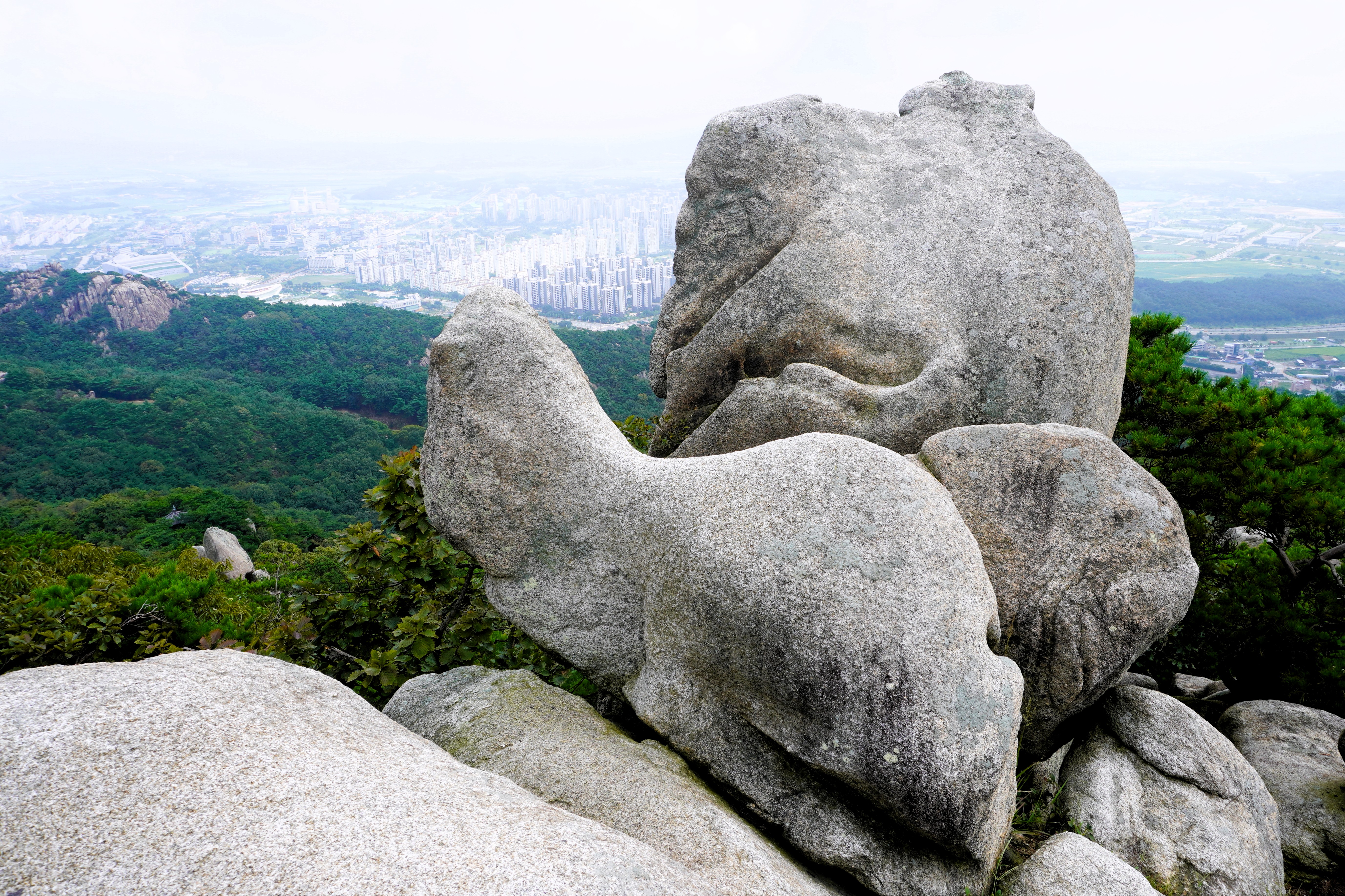 잠깐의 쉼으로 고인 에너지를 쏟아부어 바위 꼭대기에 올라서서 잠시 숨을 고르고 있었는데... 이 특이한 바위. 삽살개바위라는데... 애써 그 조각을 맞추면서