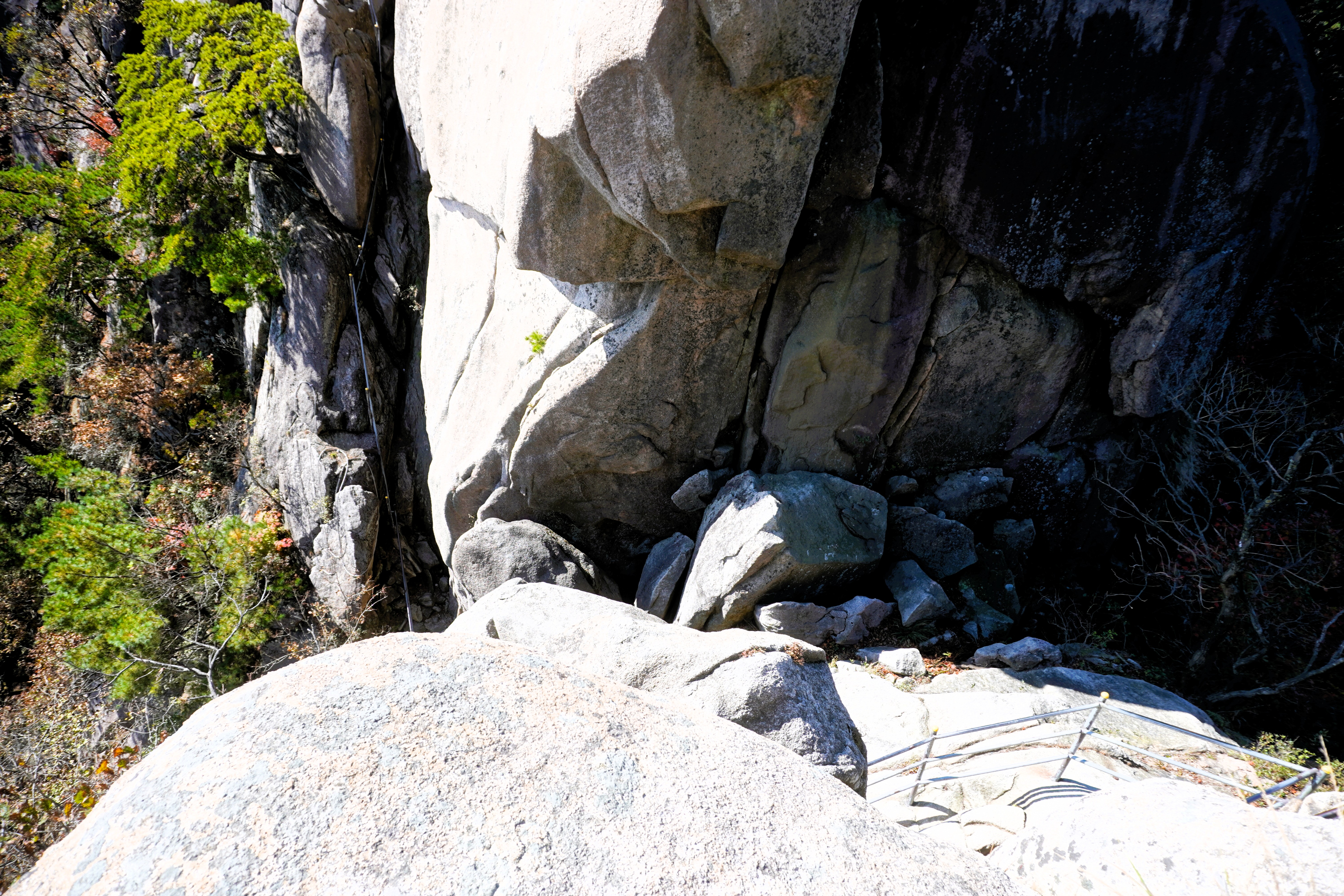 안말능선 위를 걷는 것인가 보다. 암튼, 그 능선을 따라 걷고 있으니 대단한 크기의 바위 옆을 오르는 계단이 나오는데... 계단이 설치되기 이전의 길도 보였다. 어휴~ 오른쪽 낭떠러지와 더불어 생각하니 몸에서 전율이 인다.