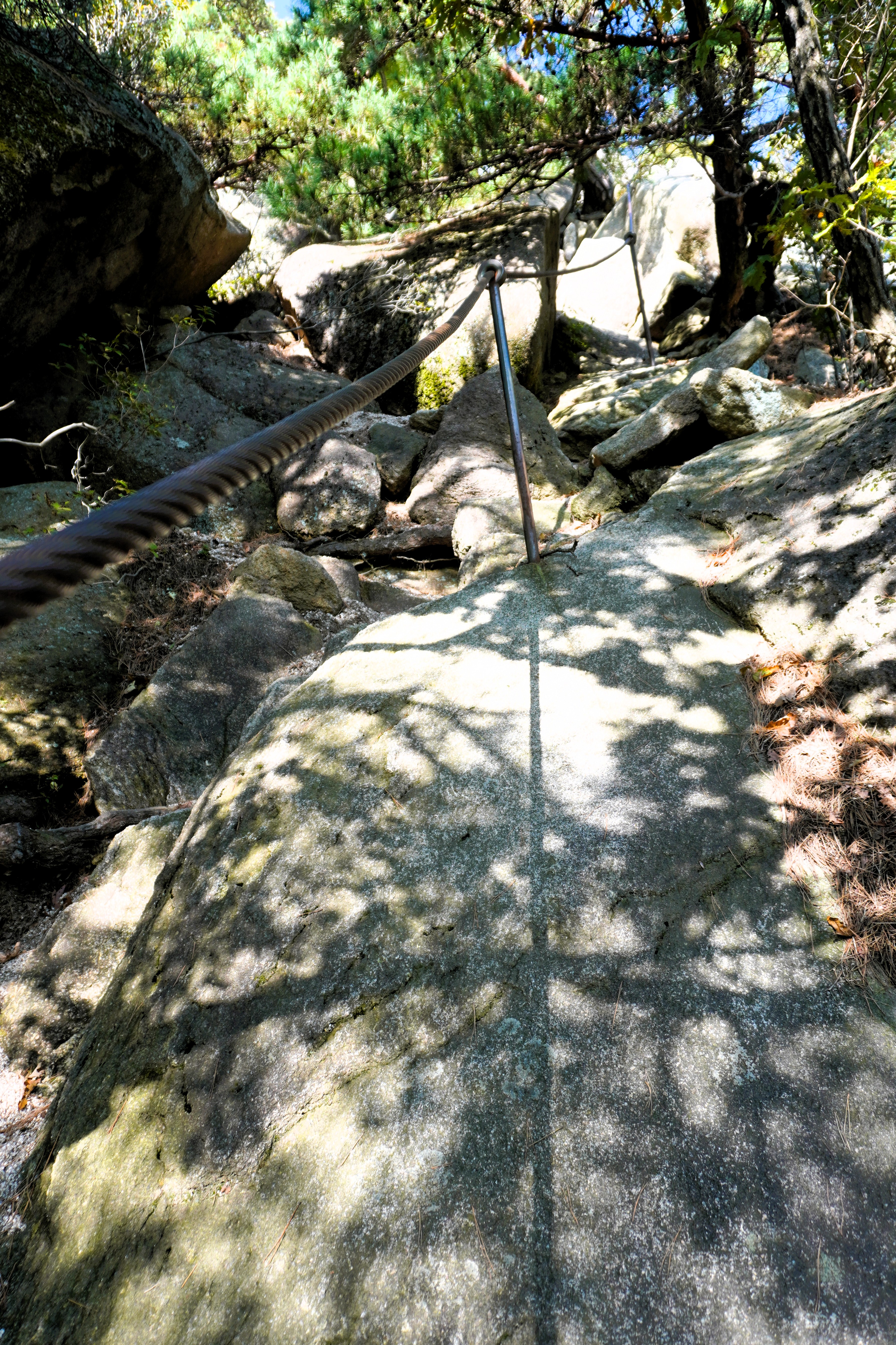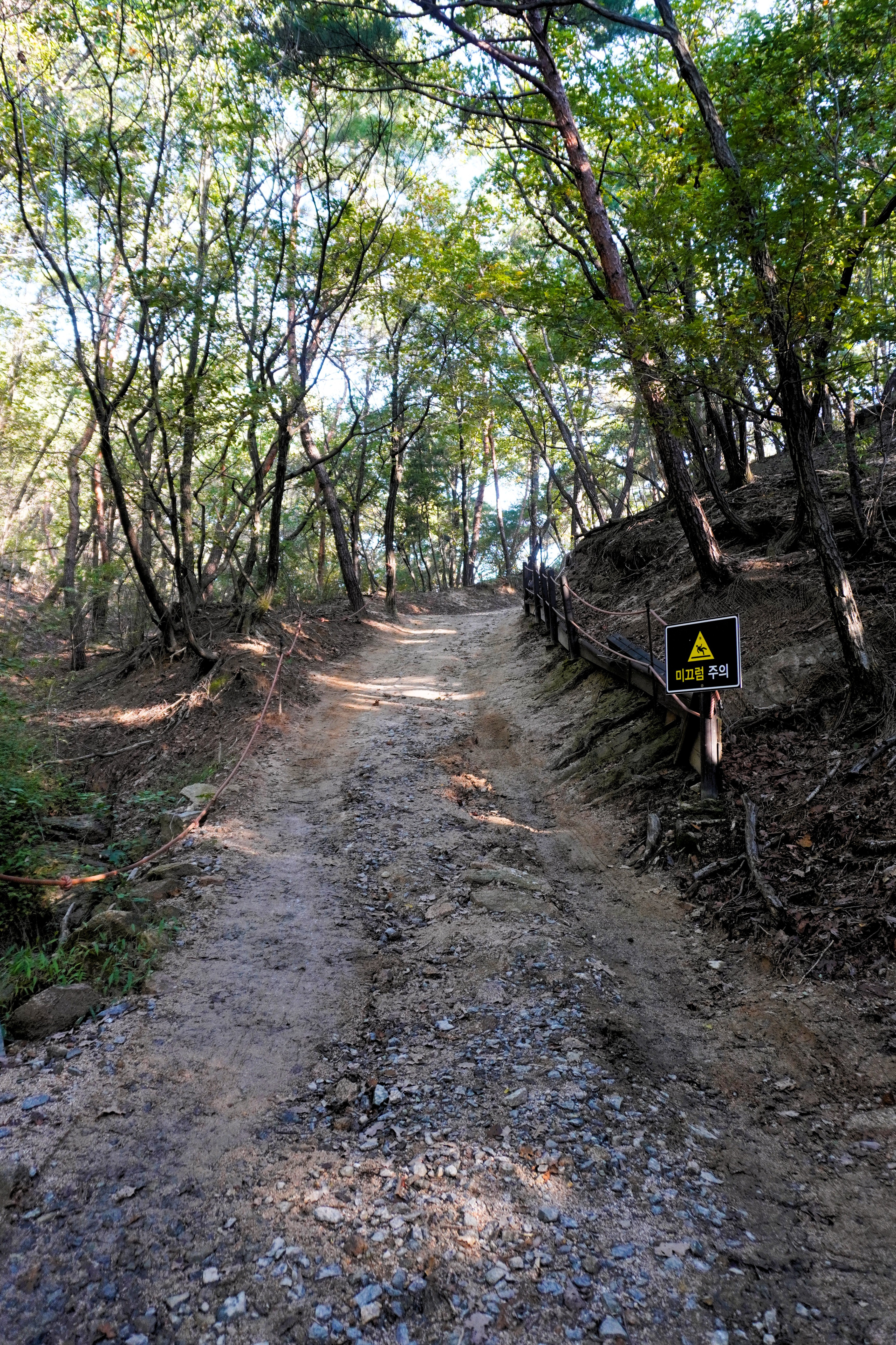 왼쪽 사면으로 향하는 길로 들어섰는데... 우씨! 길이 가파르게 올라치더니 희미해지네...? 아 몰라!! 고집스럽게 올라갔더니 금줄이 보이고 그 너머엔 좀 더 뚜렷한 길이 보였다.