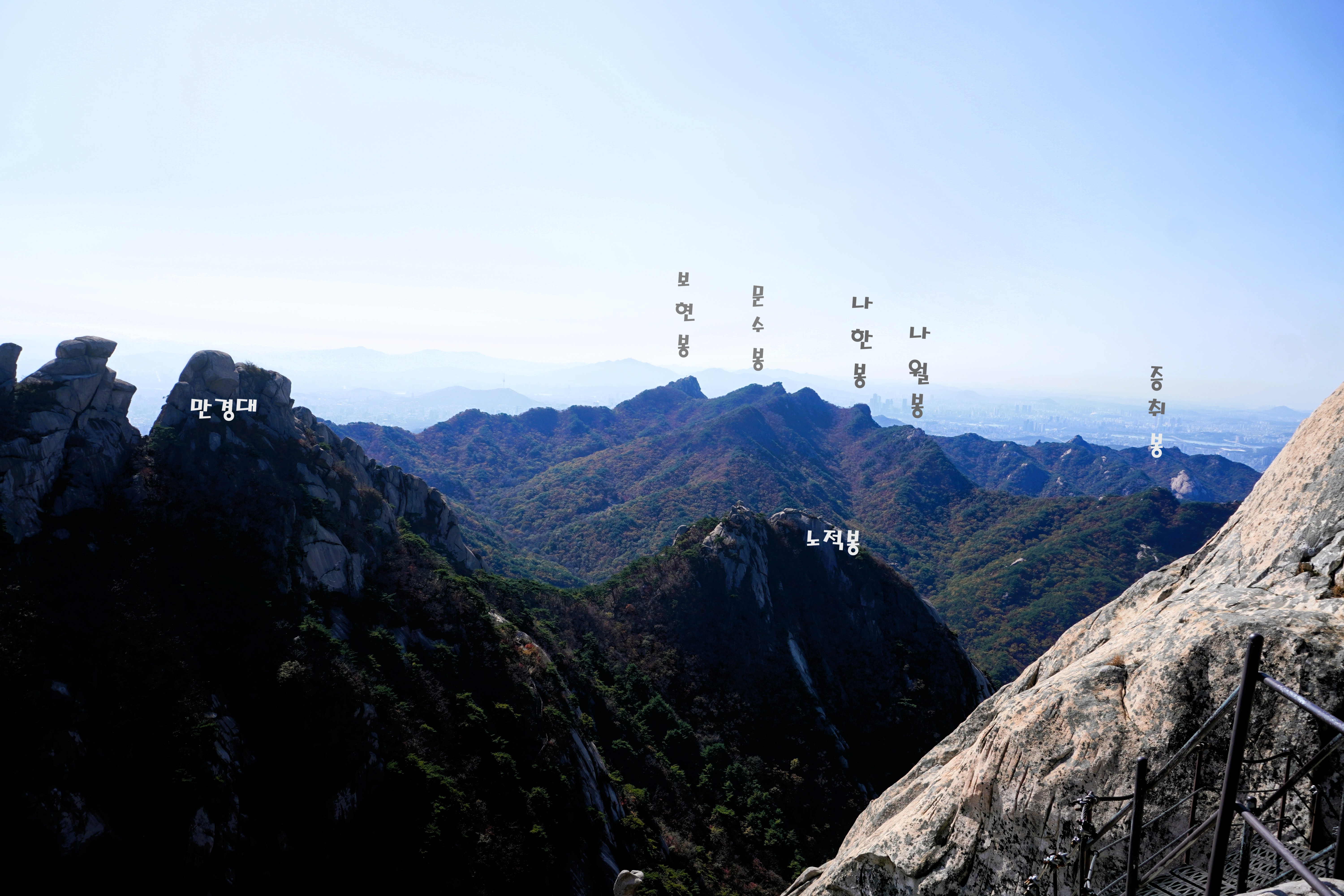 마당바위로 내려서서 이번엔 얼마 전 다녀온 의상능선의 봉우리들의 이름을 한 번씩 불러주고는