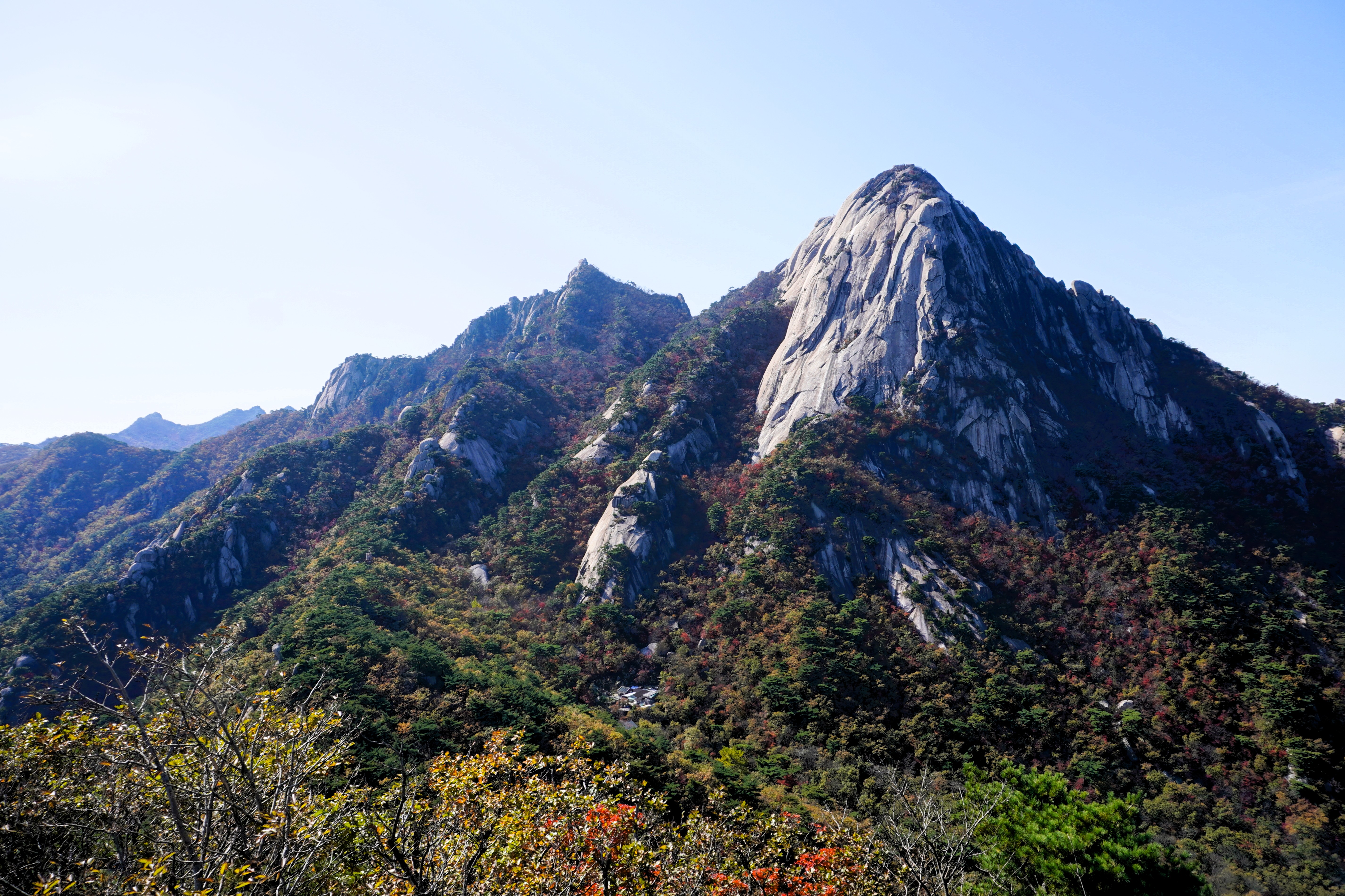 우선은 멋진 근육을 뽐내는 인수봉과 그 뒤쪽의 만경대를 보고... 엇? 인수봉 아래쪽의 단풍도 화사해 보이는 걸?