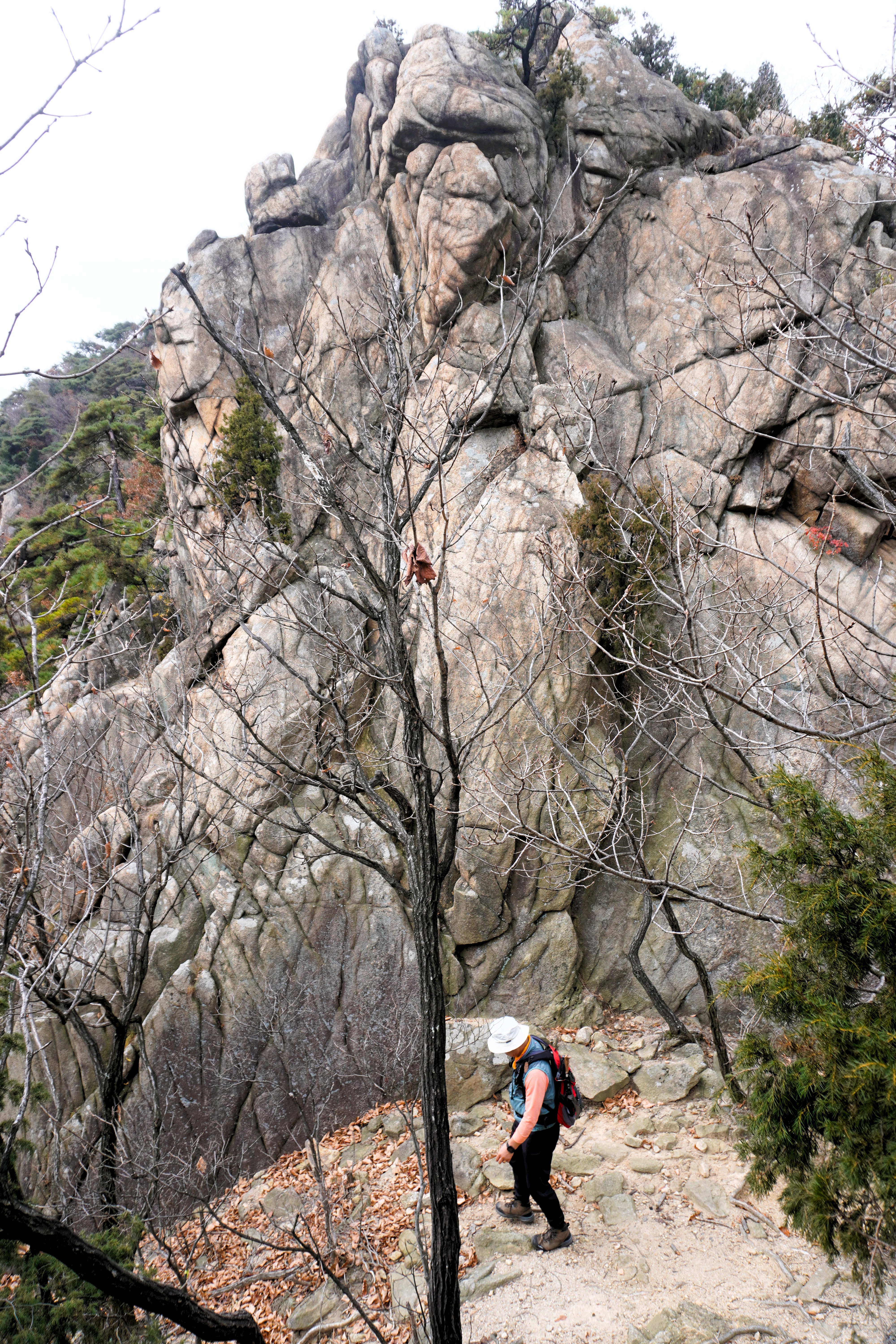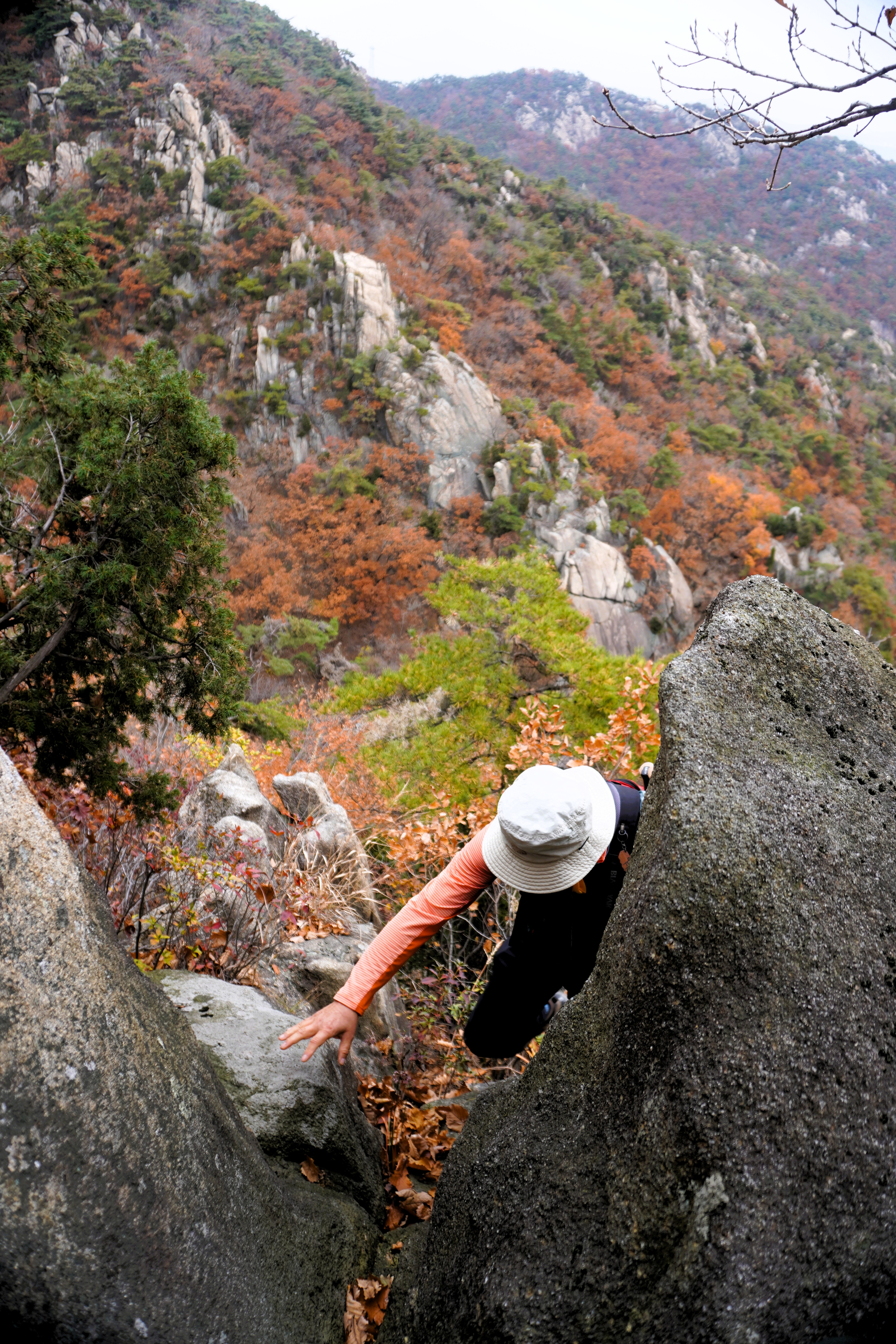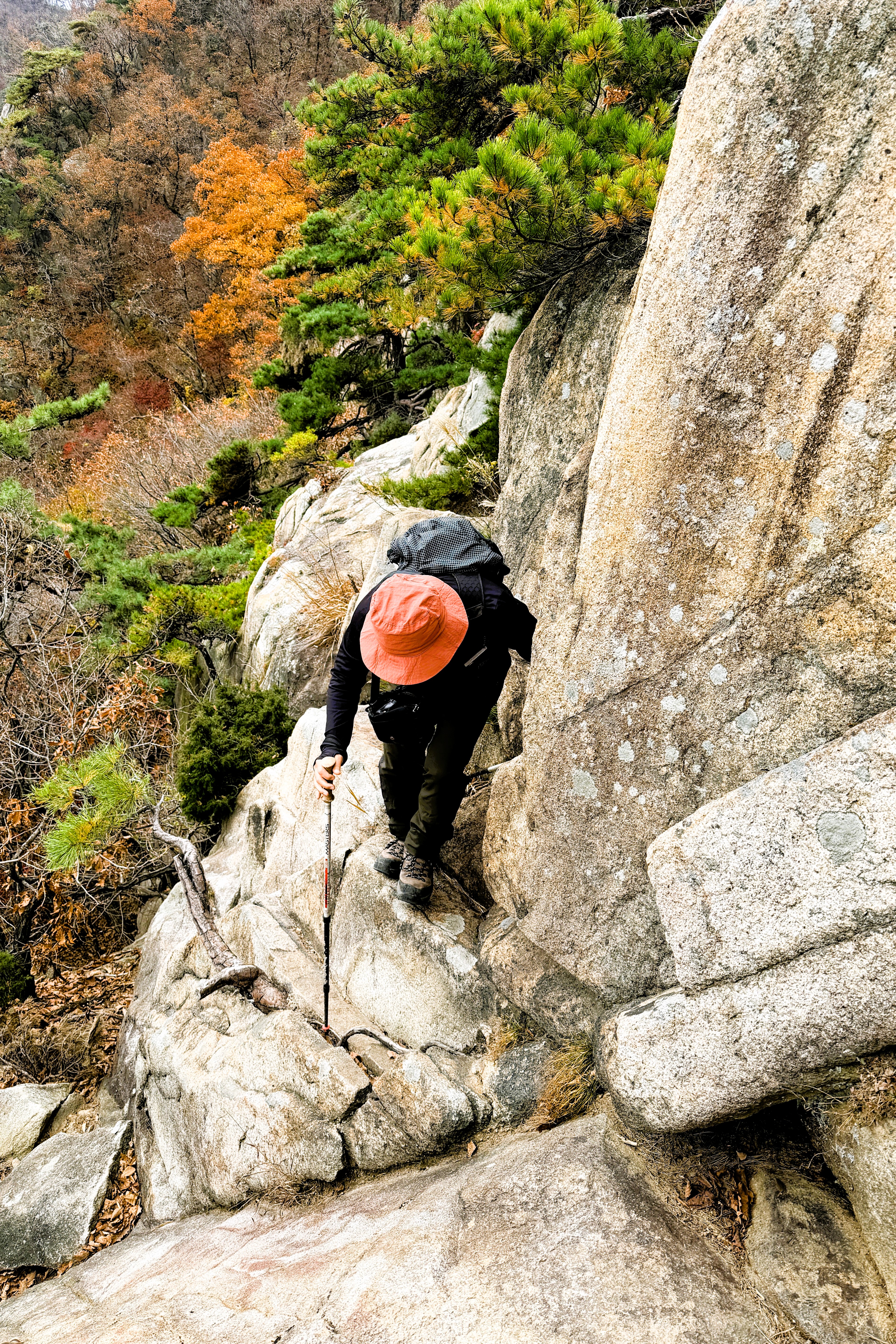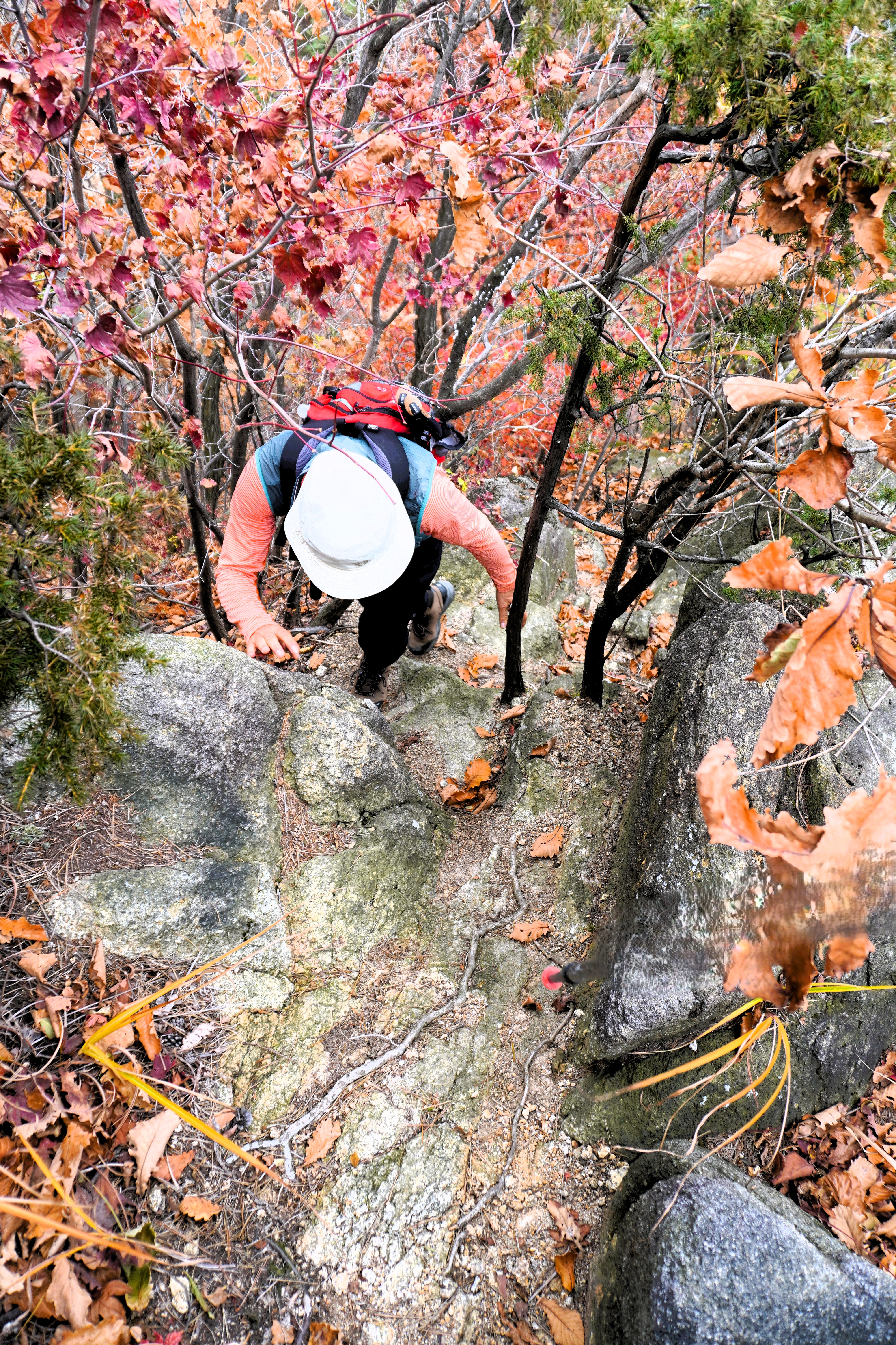 낙엽으로 덮인 가파른 마사토길을 오르고 이번엔 두 손 두 발을 모두 사용해 조심스럽게 암릉길도 오른다.