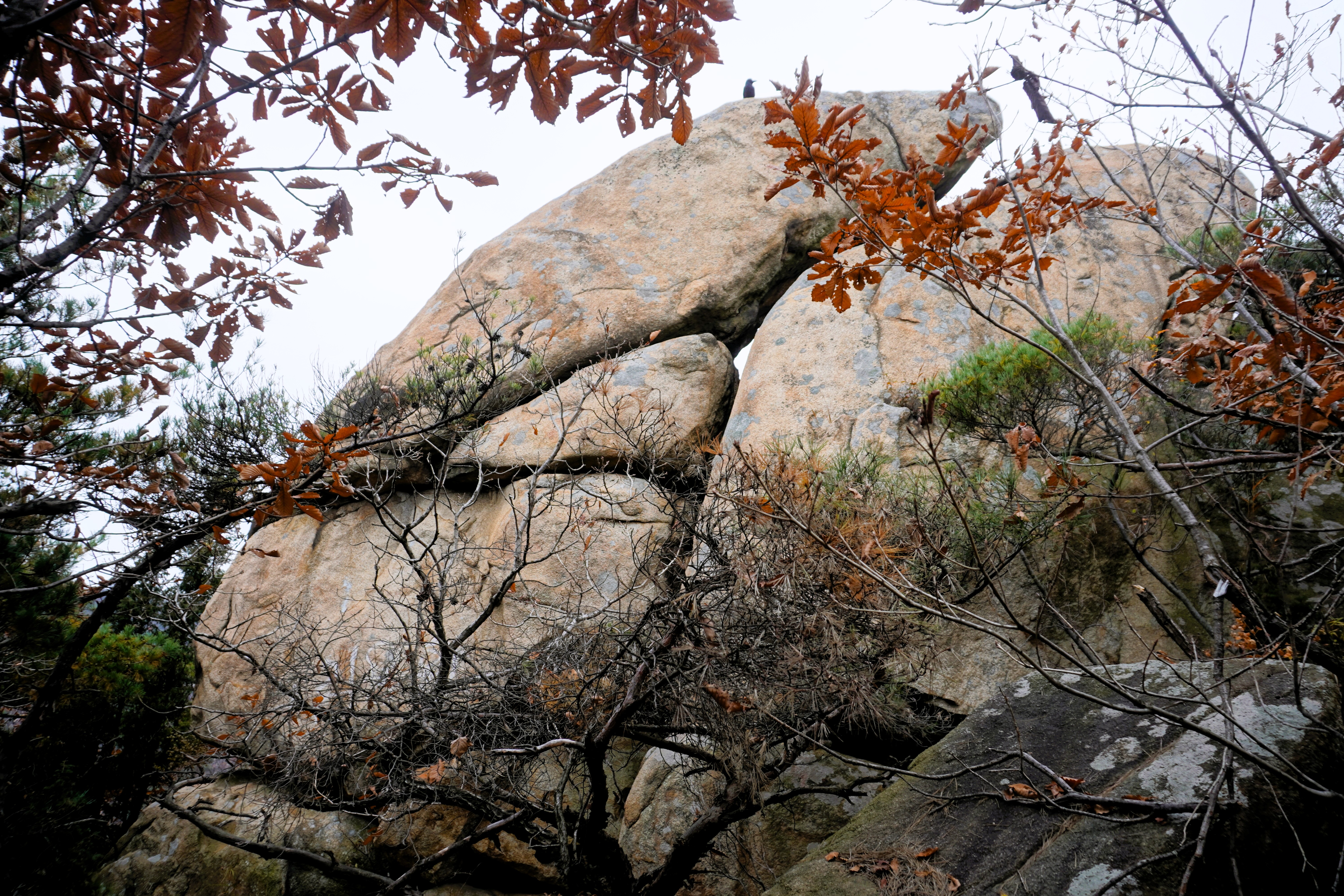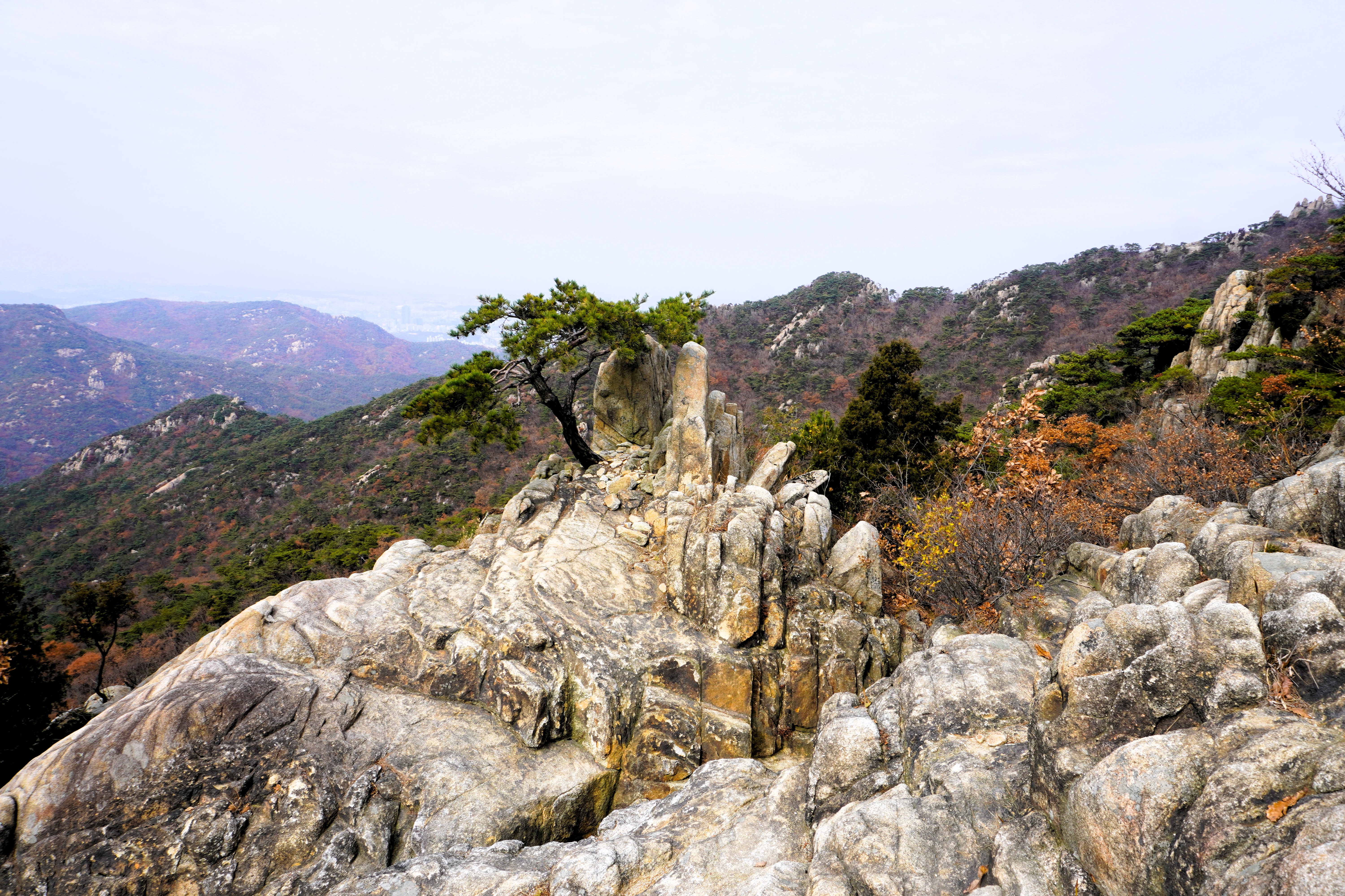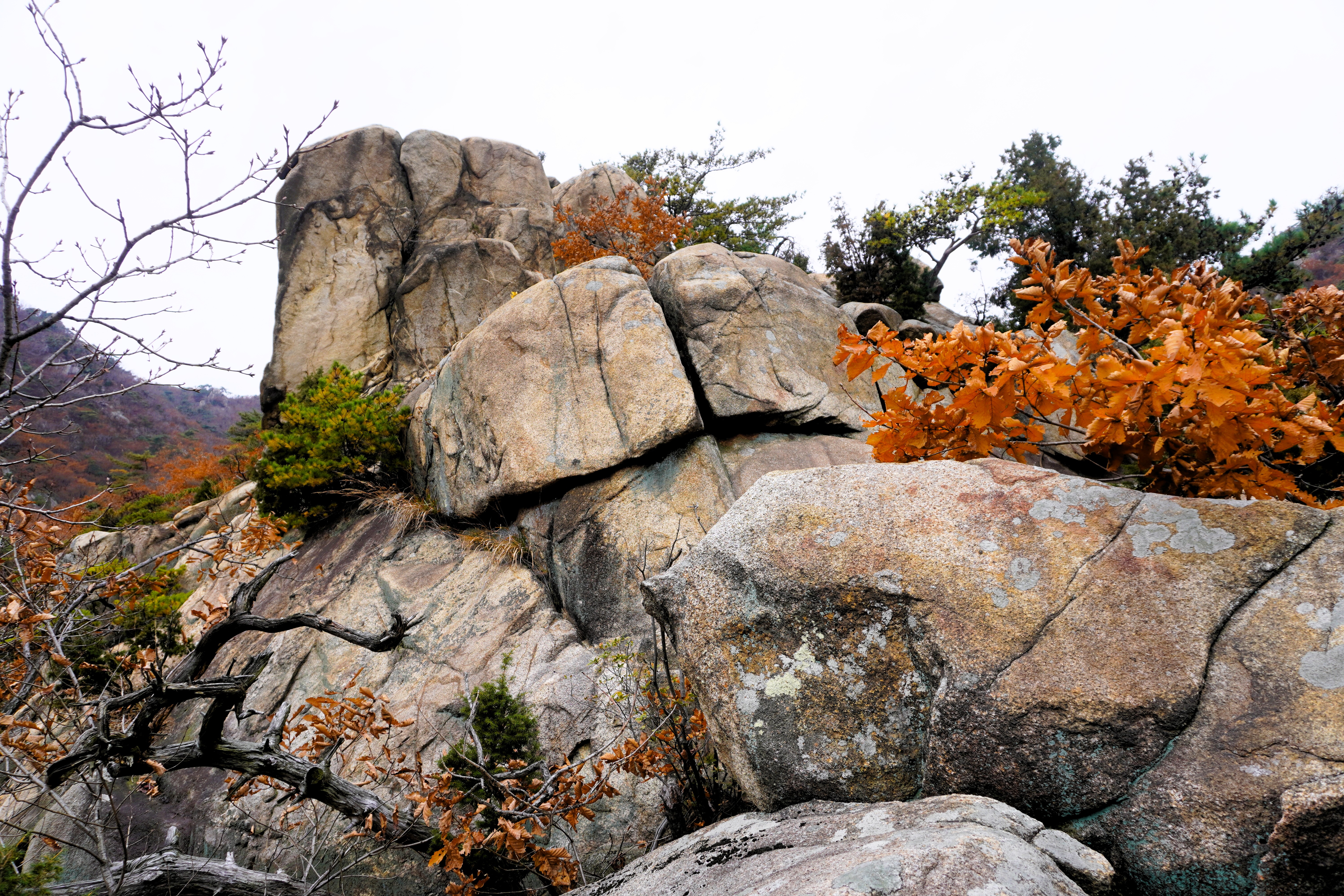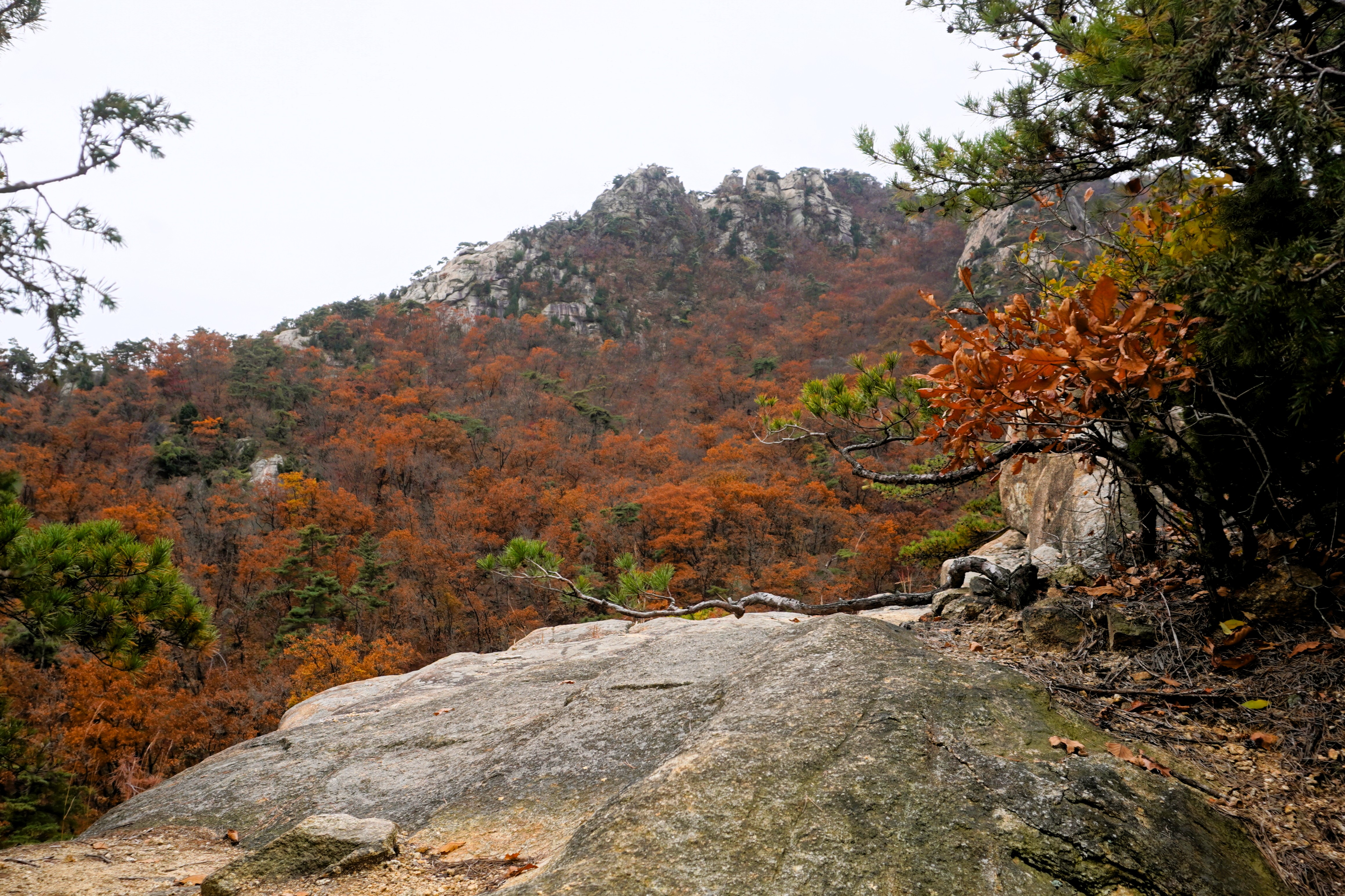 개구멍을 통과해서 바로 눈에 들어서는 괴암과 육봉능선. 완연한 가을풍경이다. 안타까움이 있다면... 멀리 보이는 것은 멋진 단풍이지만 가까이 보게 되면 잎이 거의 말라있다는 것.