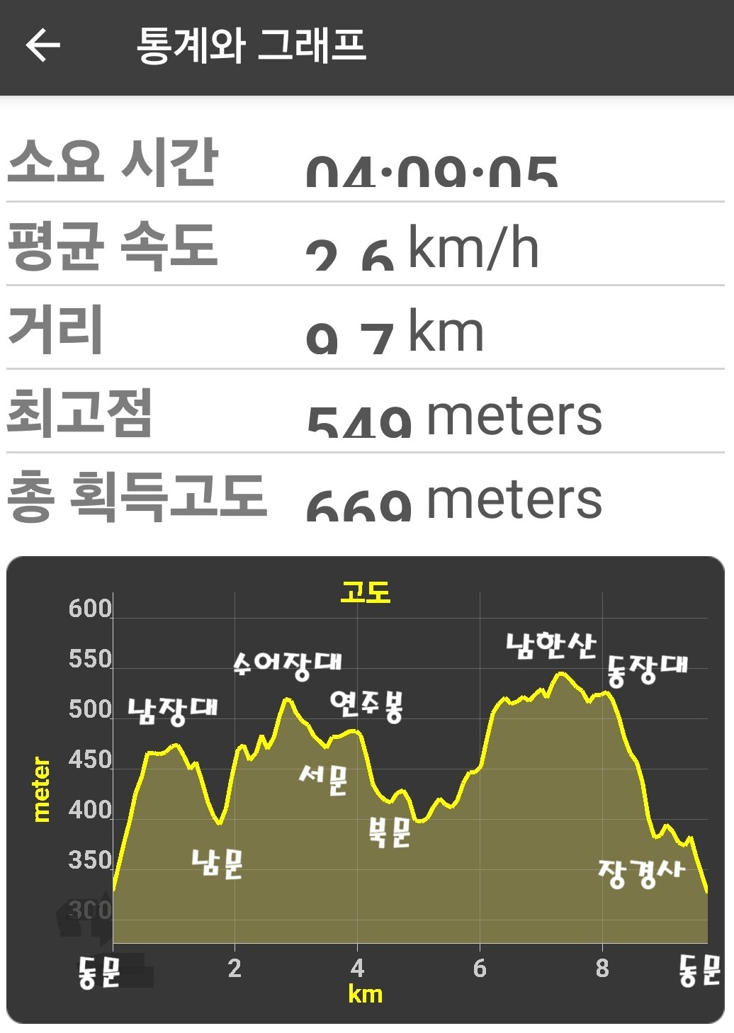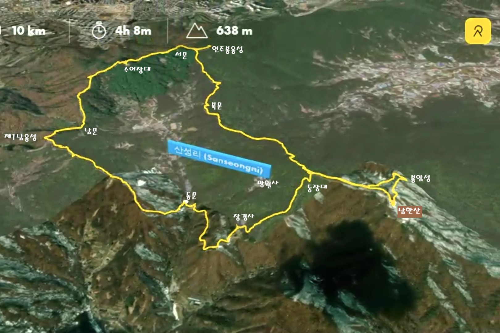 동문 - 남장대터 - 남문 - 청량산(수어장대) - 서문 - 연주봉옹성 - 북문 - 벌봉 - 남한산 - 동장대터 - 동문으로 원점회귀를 했다.