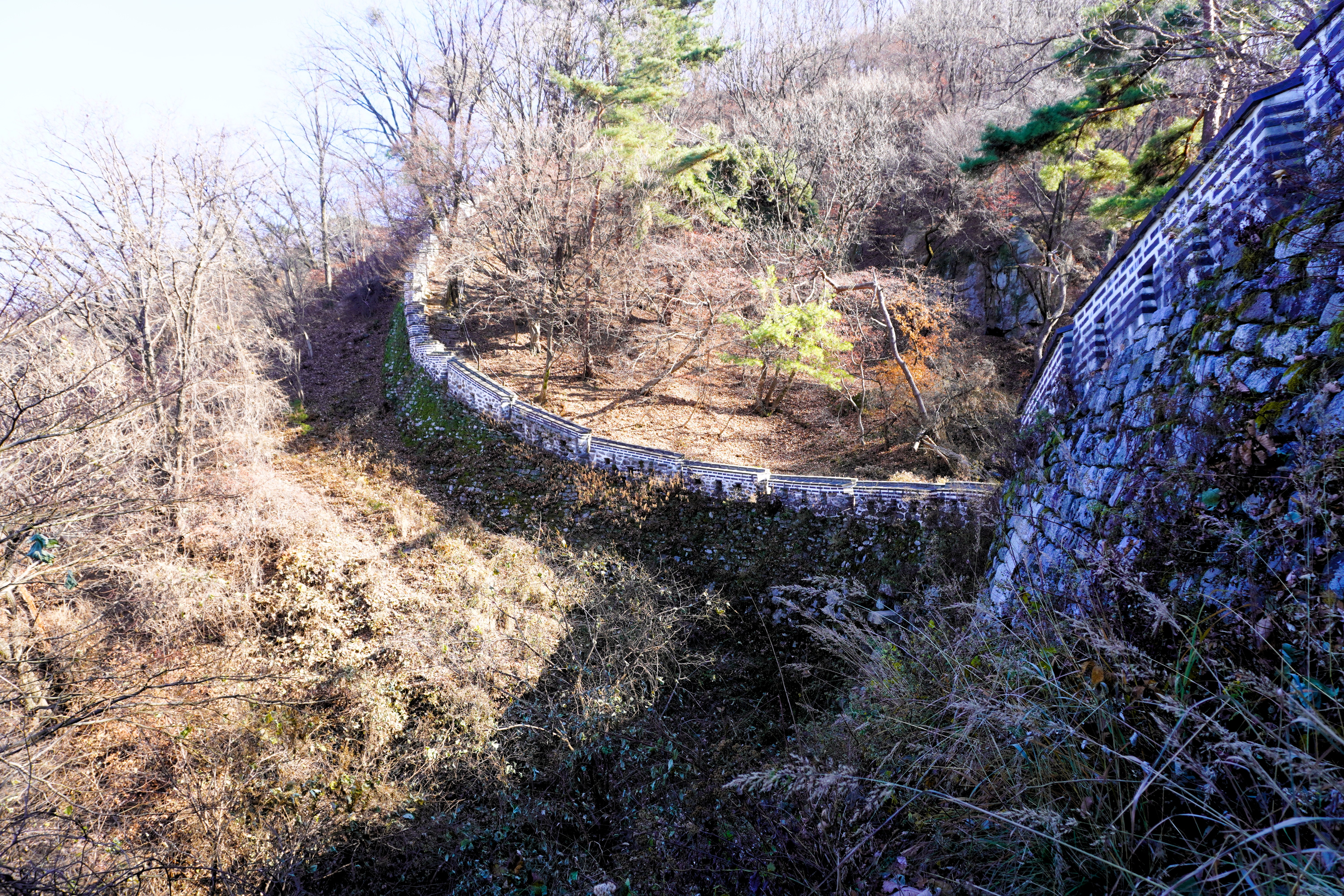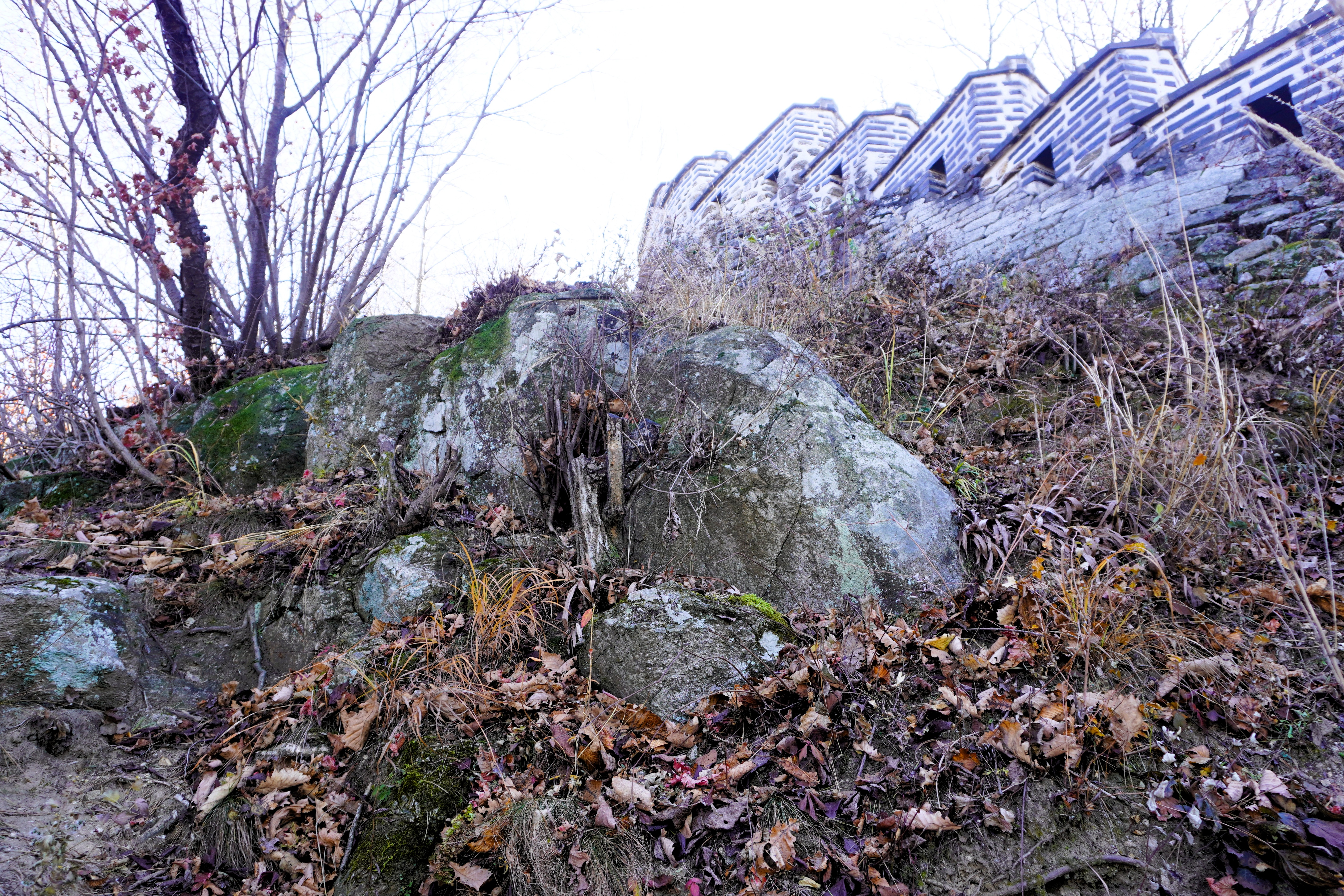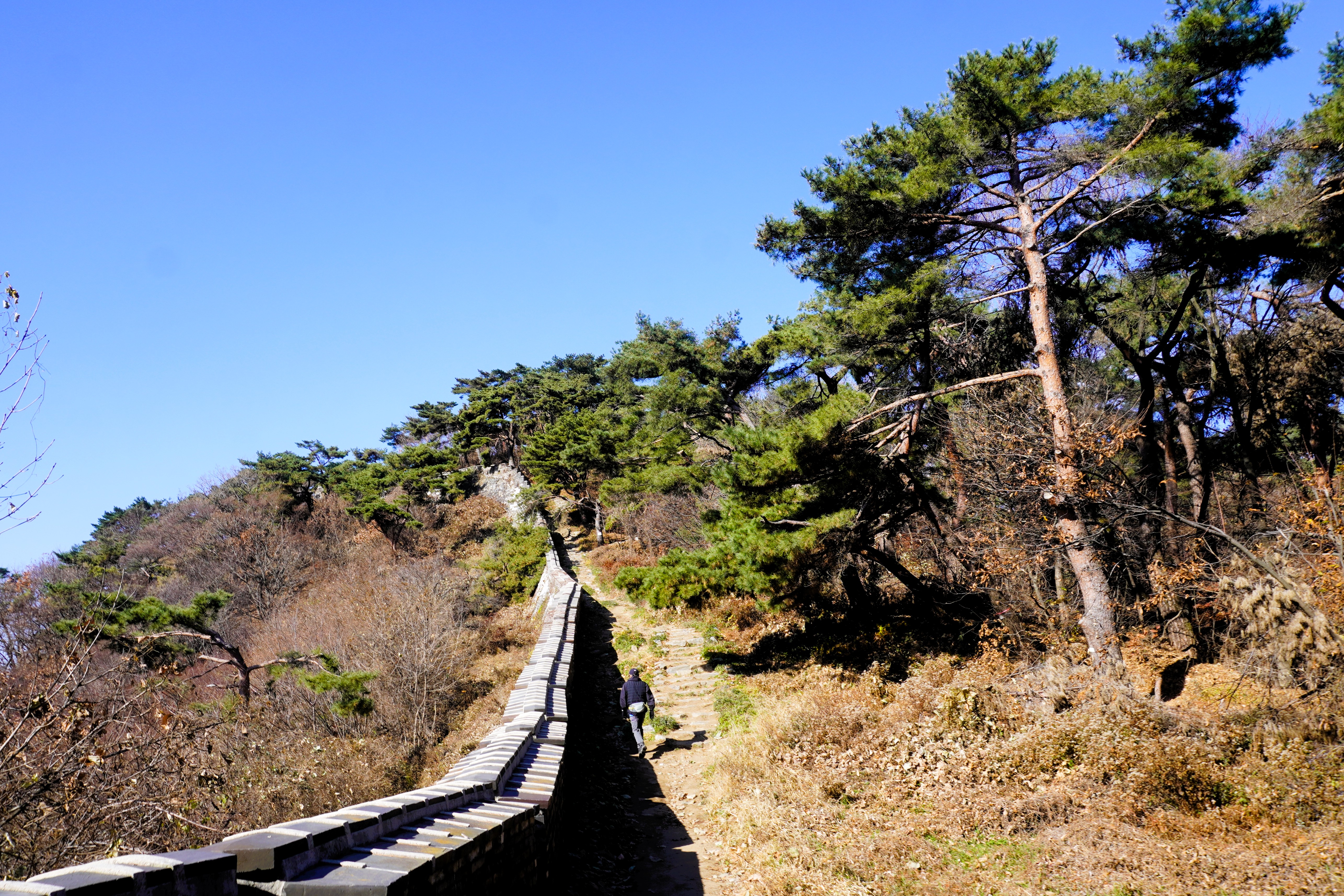 하산을 시작한다. 저 앞에 보이는 것이 장경사신지옹성이고 2 암문을 통해 밖으로 나가 멋진 나무를 감상하기도 했지만