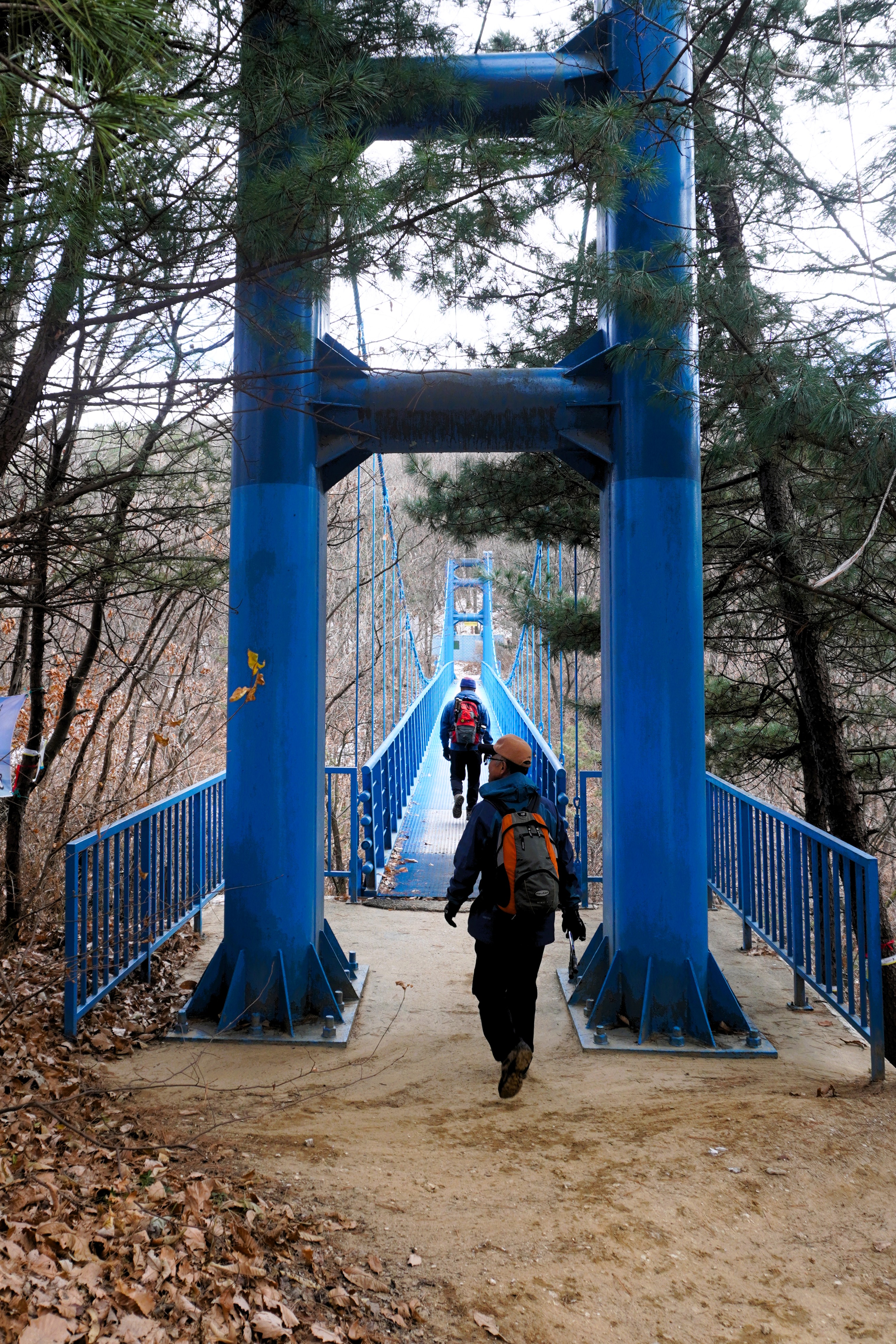 조금 가다보니 머리 위로 파란색 다리가 보이는데... 천안에서 거주하는 목이가 말하길 그것이 구름다리라고 한다. 건너가야 제 맛이라서 애써 왼편 산자락에 있는