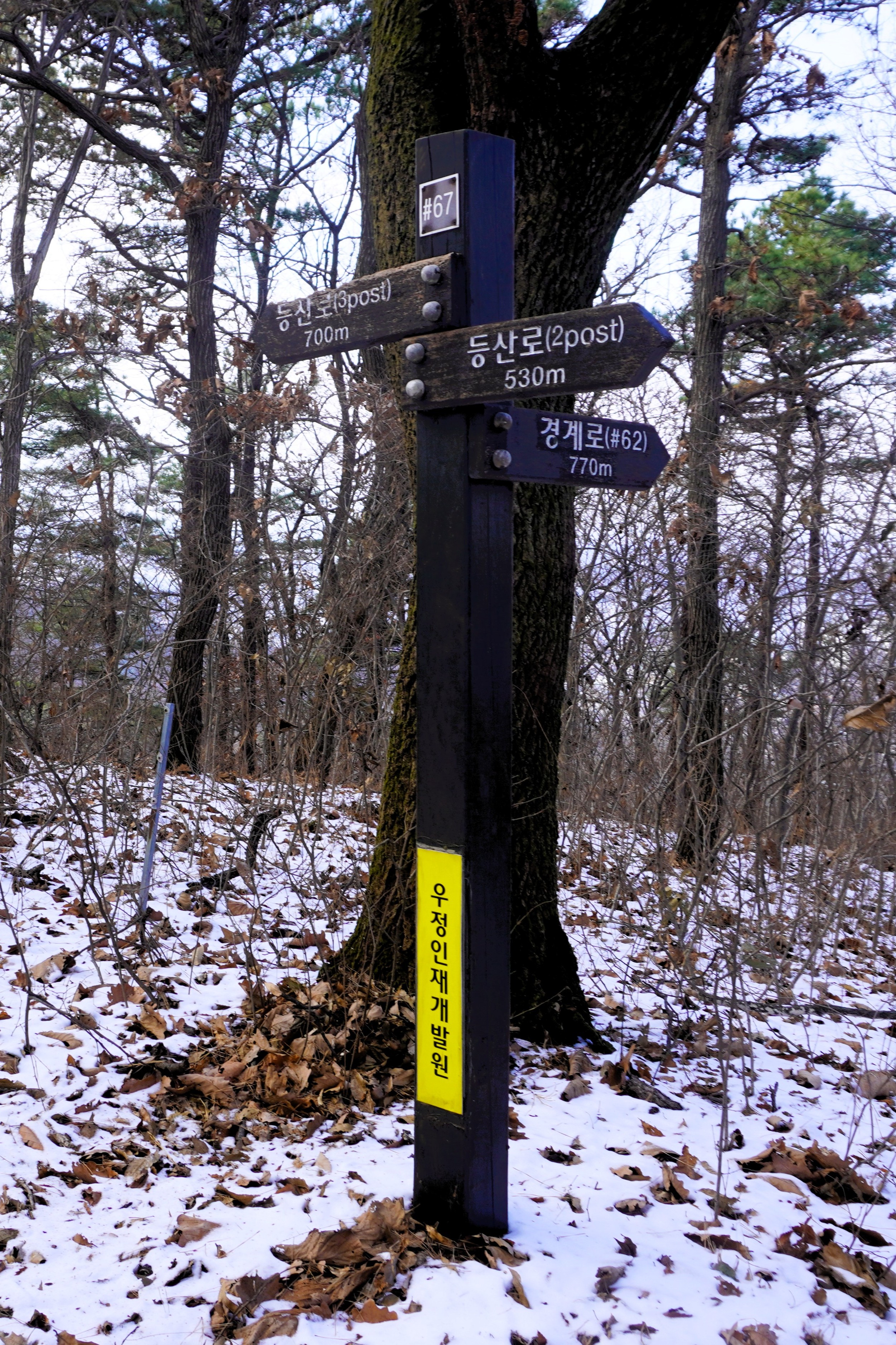 어제 수도권은 눈이 많이 내렸는데, 쌓인 눈의 양을 보니 이곳은 그렇지 않은 듯. 암튼 그래도 첫눈이니 살짝살짝 밟아가며 작은 구릉을 넘나들다 보니 대머리바위까지 남은 거리가 230m.