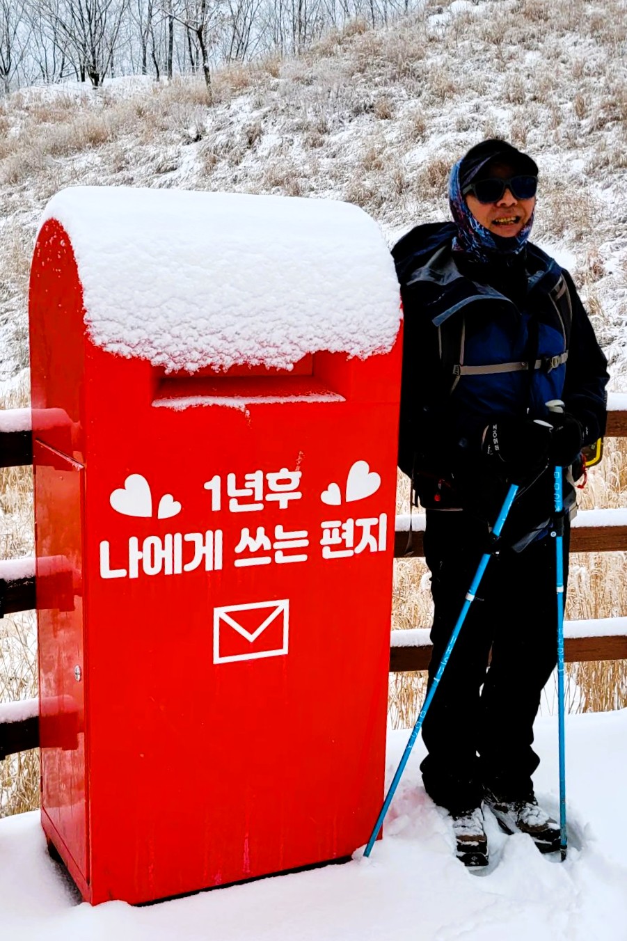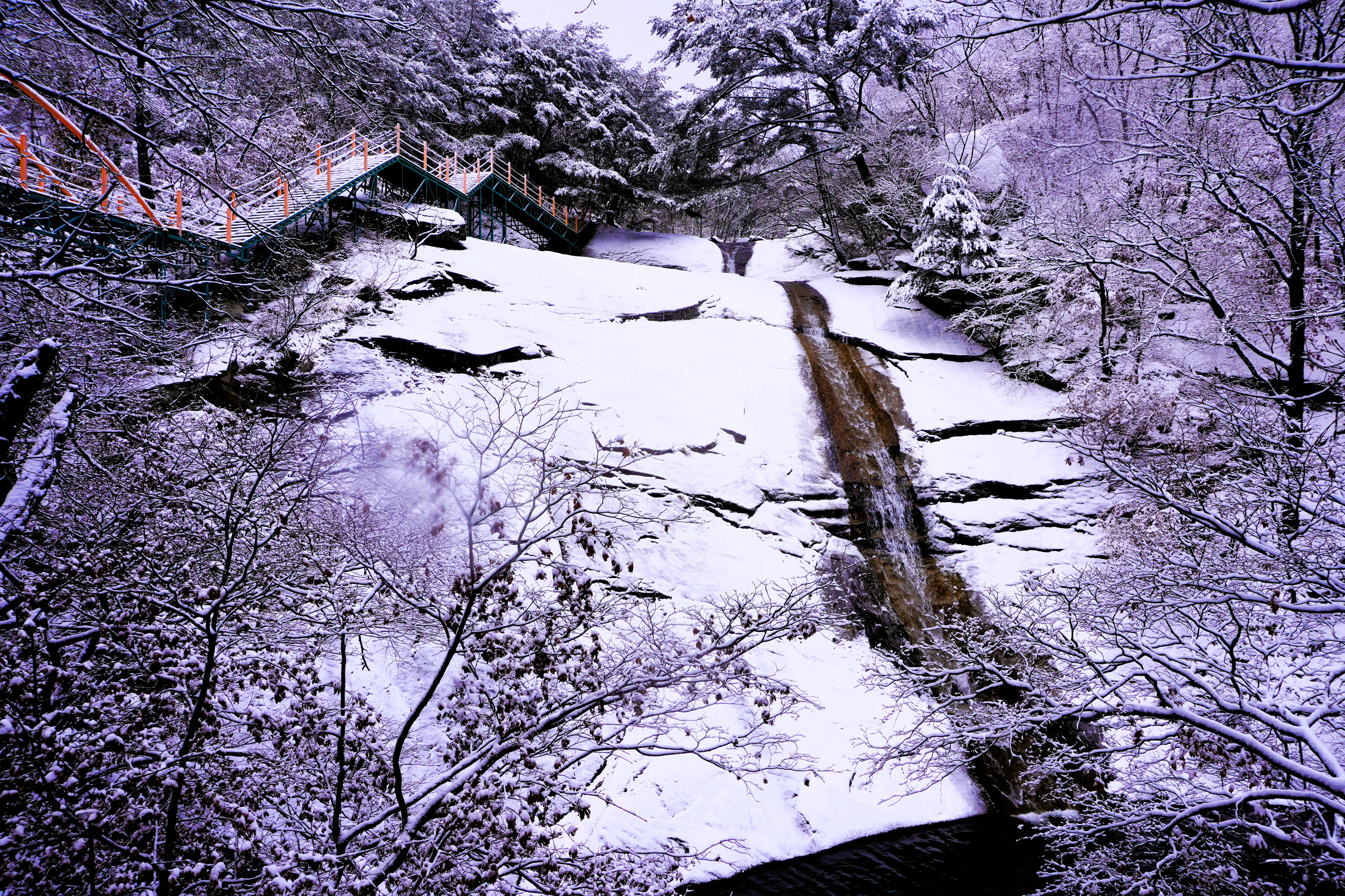 흰 눈 속에서도 밝게 빛나는 다리의 색과 모양이 멋져서 한 컷! 또