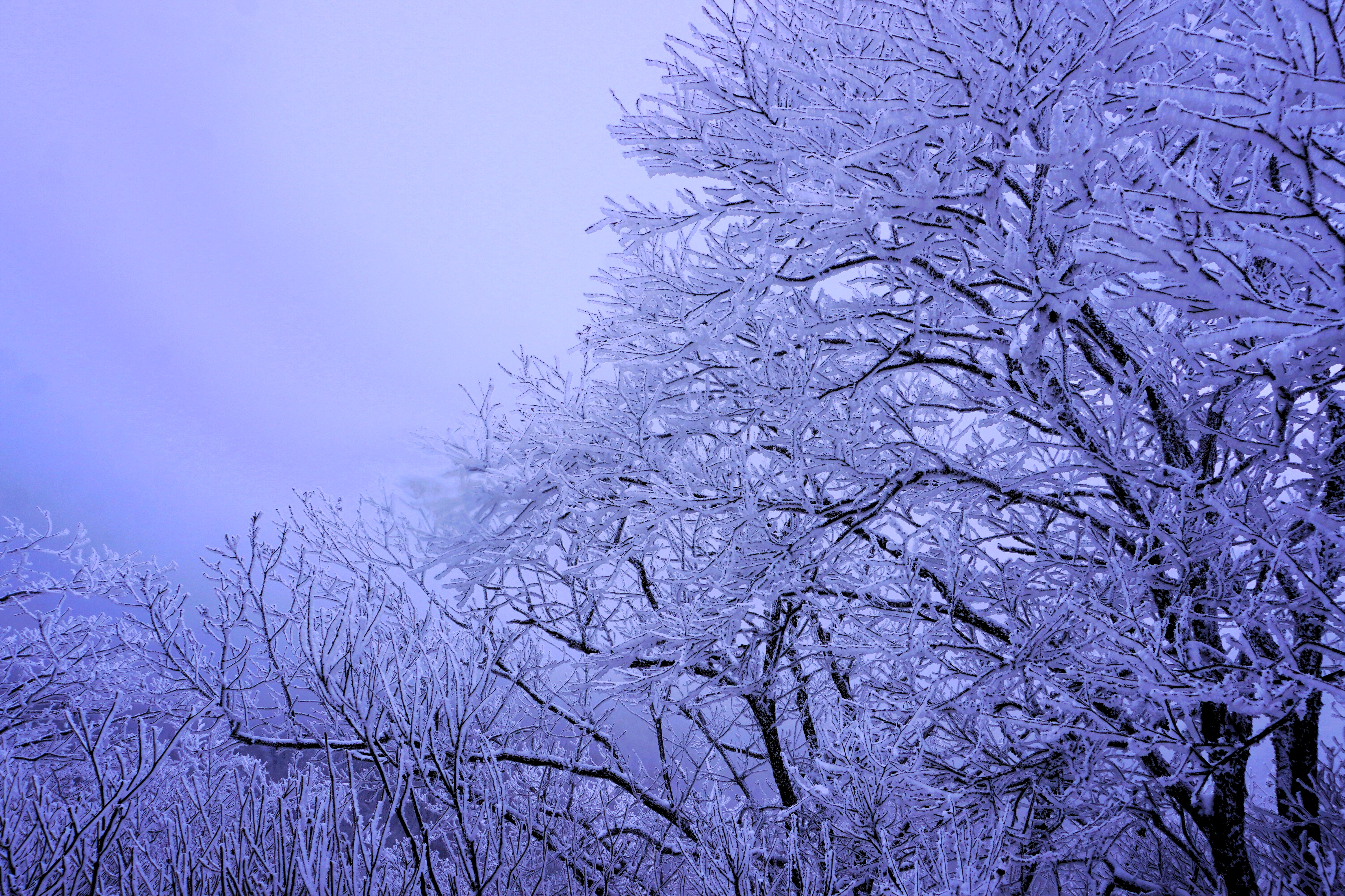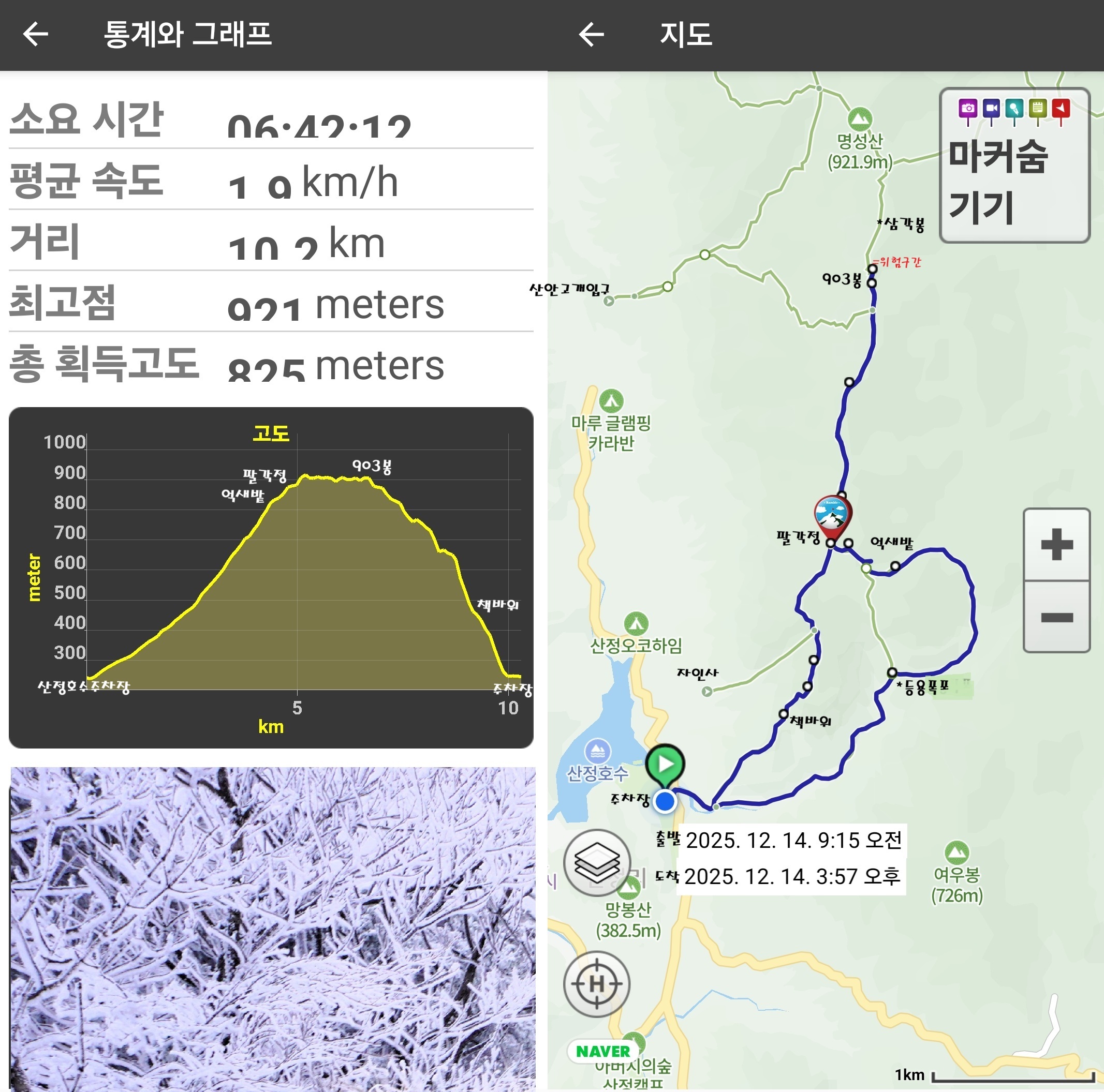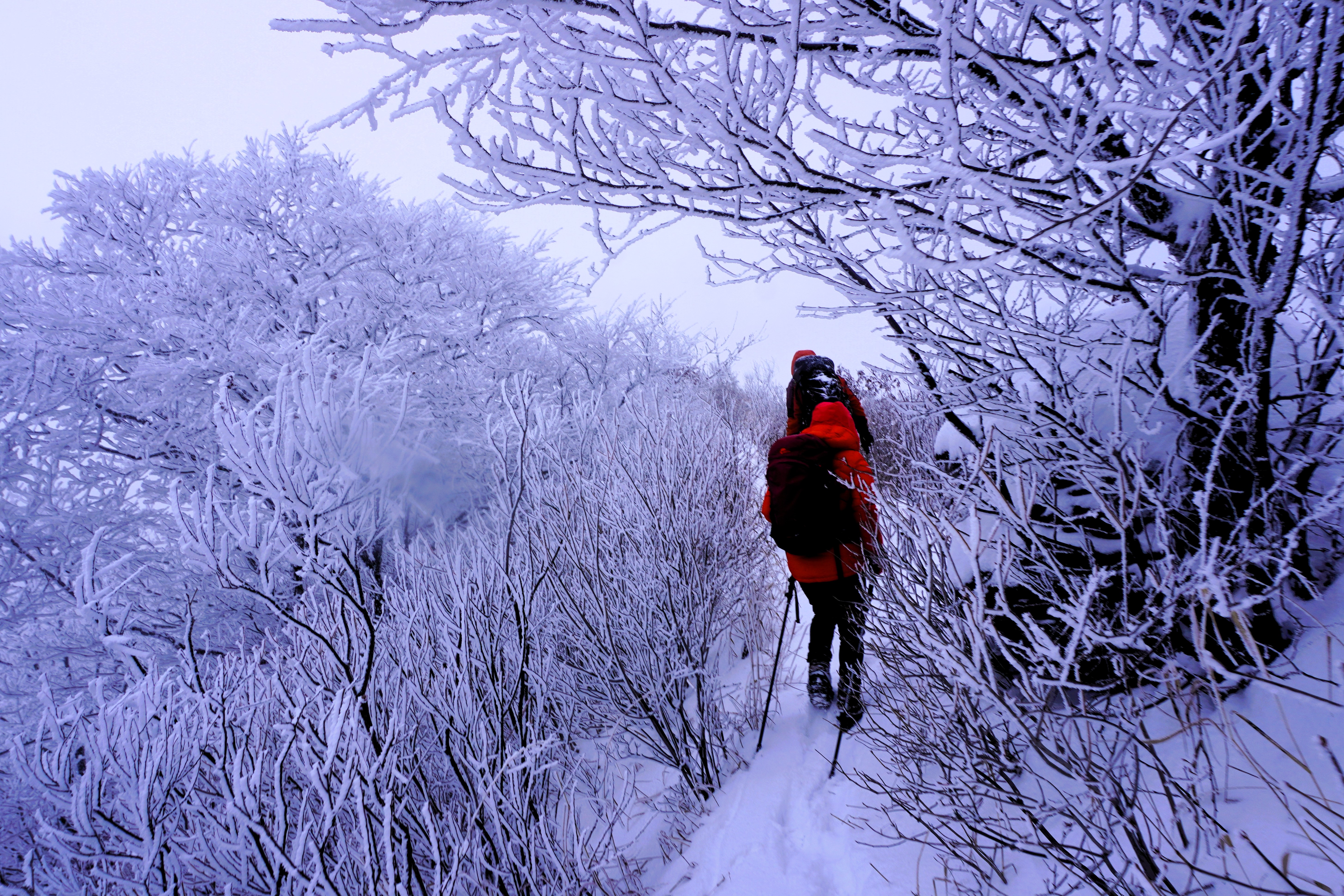 길가에 있는 나무들의 모습이 또 지나왔던 나무들의 모습과는 작게나마 차이가 있는 것이 재밌다. 여기 나무들은 가지에 쌓인 눈을 상고대로 감싼 모습이다. 암튼,