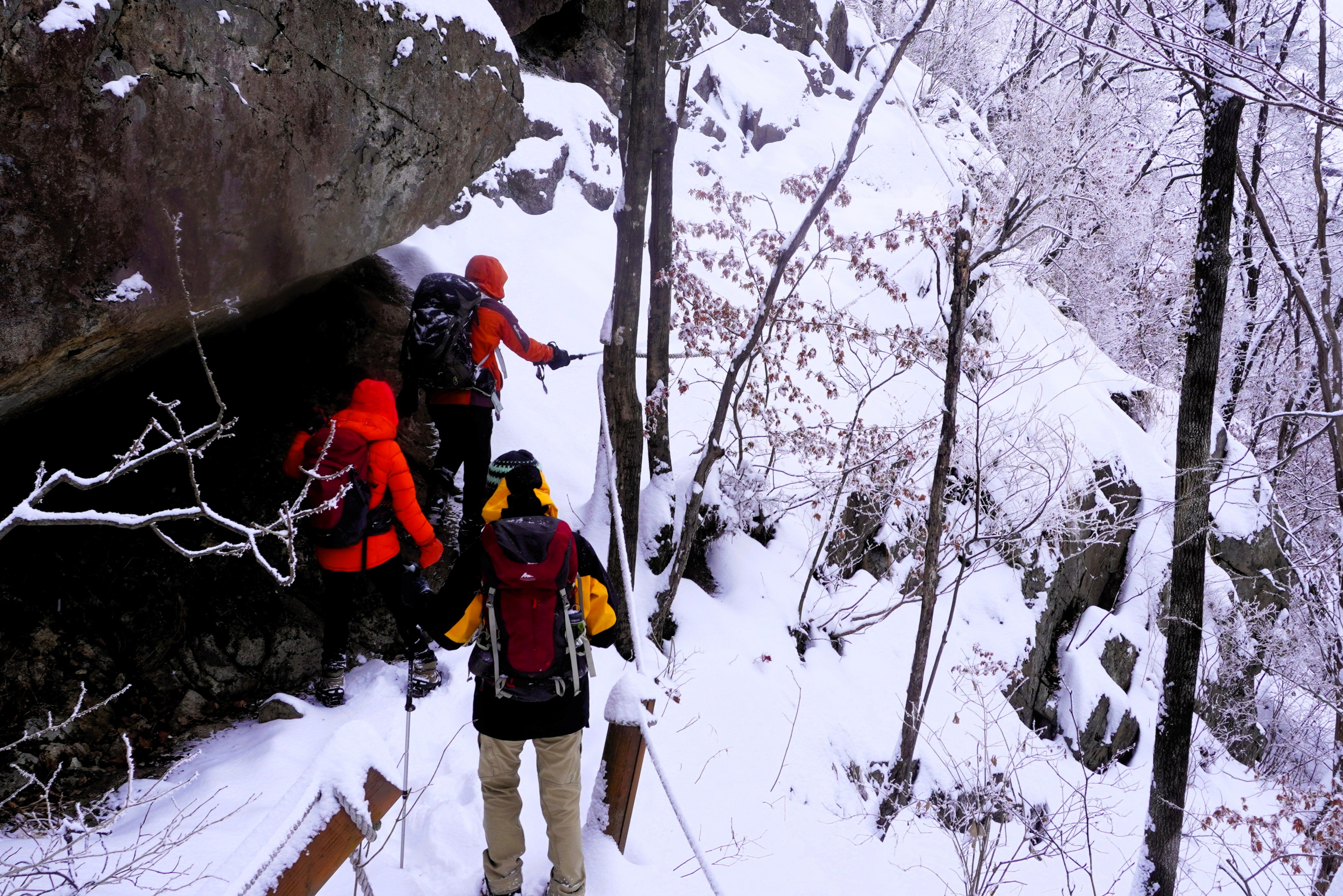 아뿔싸~~ 바위 사면에 덮인 눈을 치우니 반들반들 얼음으로 덮여있다. 오른쪽은 깊숙한 낭떨어지. 자칫 미끈 했다가는 아래로 가로지른 밧줄로는 감당이 안될 것 같고...