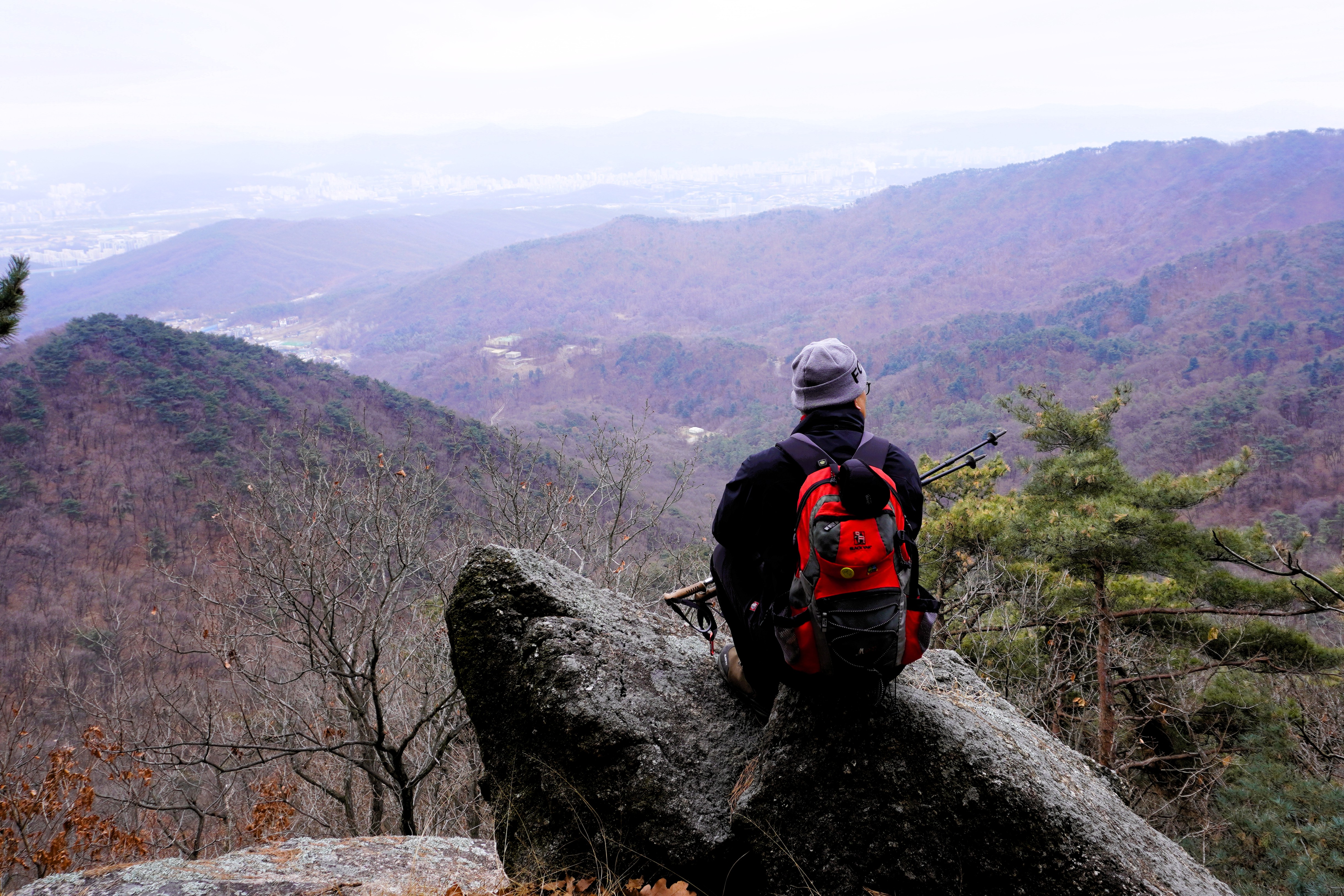 성남시를 가슴 시원히 바라볼 수 있는 숨은 전망대에 도착했다. ㅋㅋㅋ 20년 전에는 이 바위에 매인 줄을 타고 올랐던 곳인데... 암튼 뿌연 운무가 조망을 가려서 잠시 쉬다가