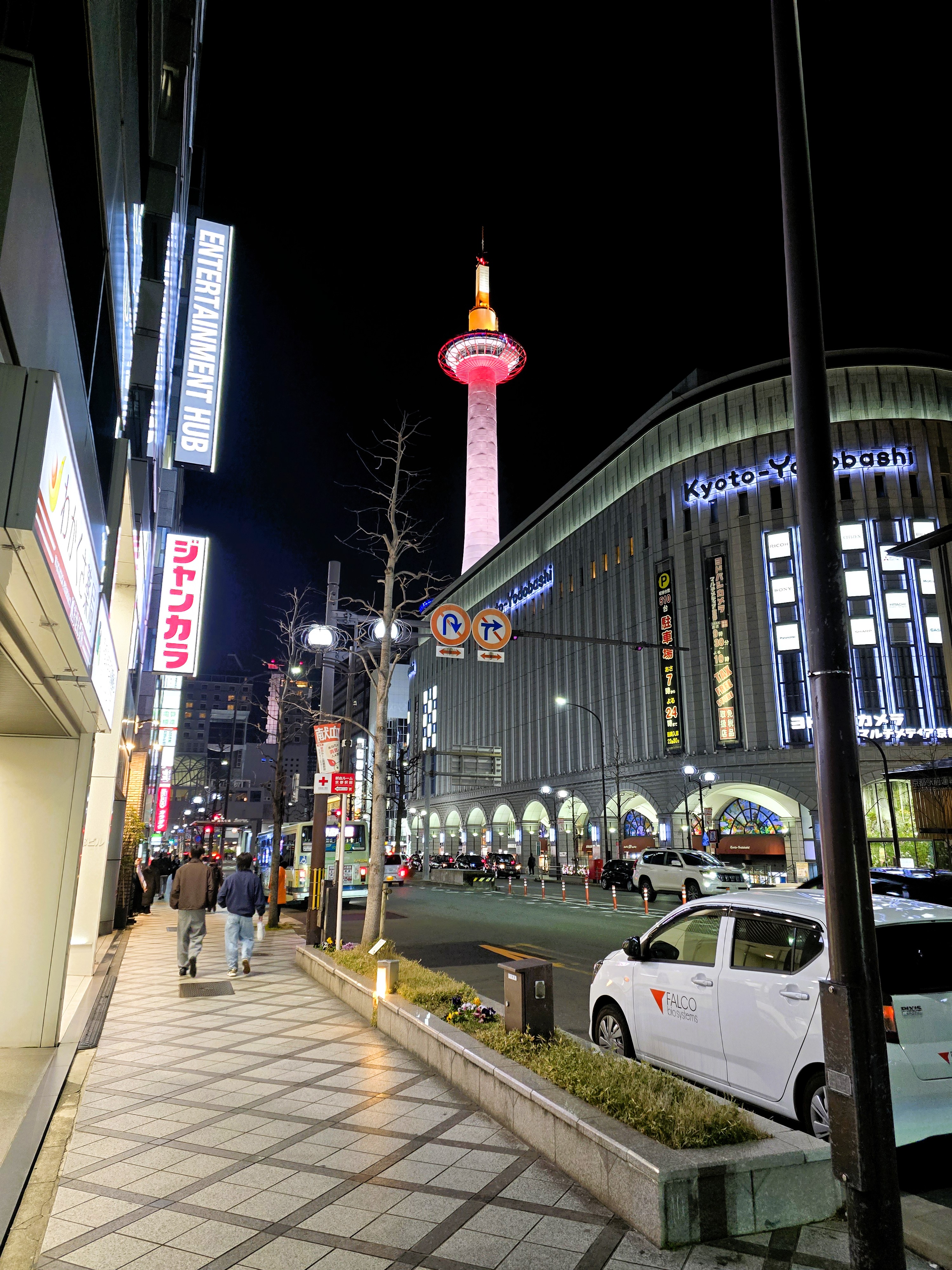 암튼, 멋진 조명으로 치장한 교토타워를 지나