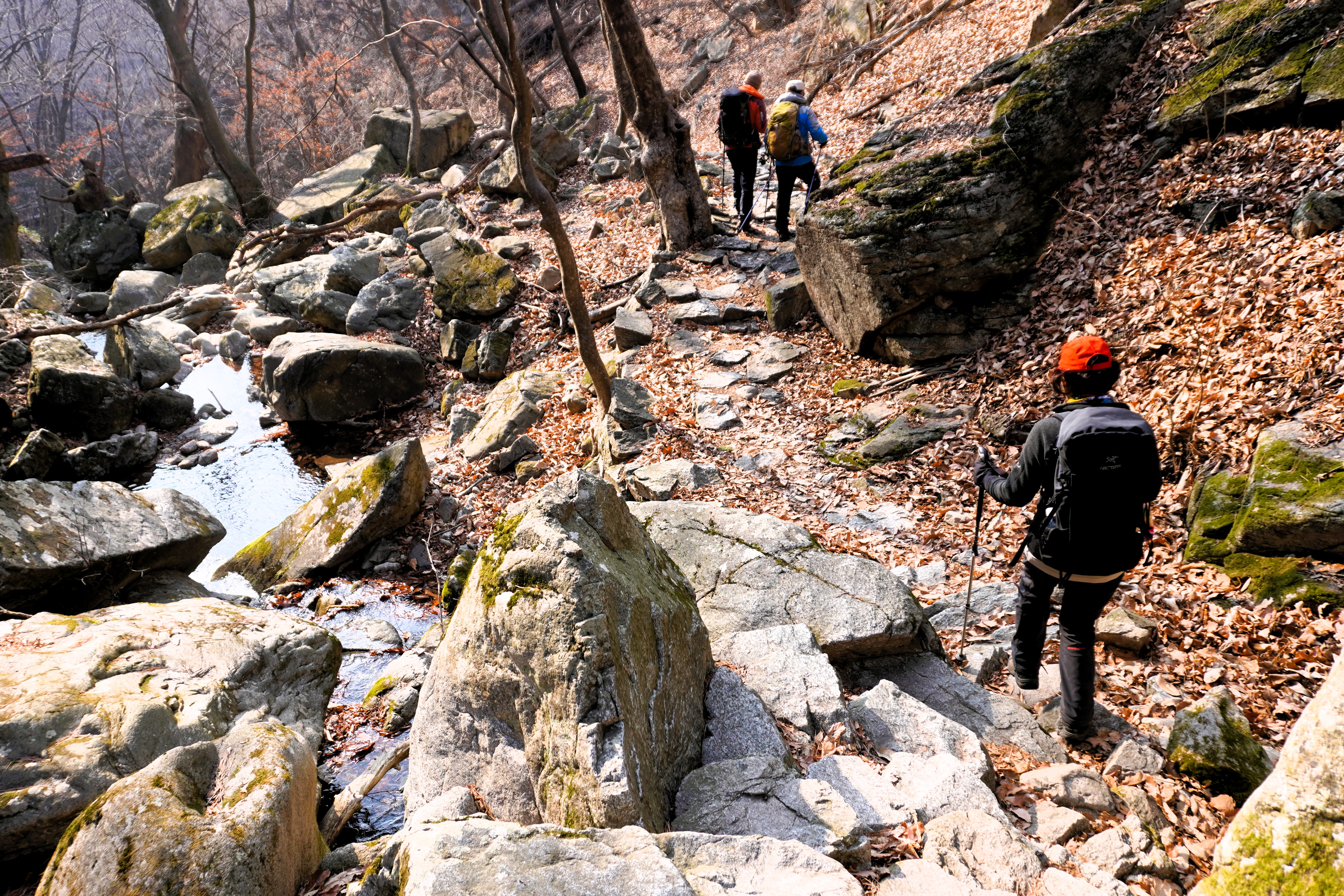 심한 내리막 너덜길을 한 20여 분 걸었더니 물 흐르는 계곡이 나왔다. 이후부터는 조금은 편한 길.