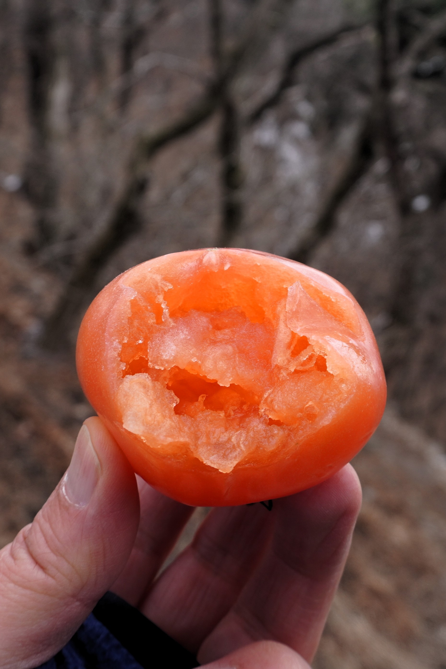 마침 바람이 없는 장소가 있어서 그곳에 자리를 잡고 있다가 일행들과 합류, 그리고 한 산우님이 가져온 곶감과 토마토로 15분 정도의 시간을 들여 에너지로 전환시켰다.
