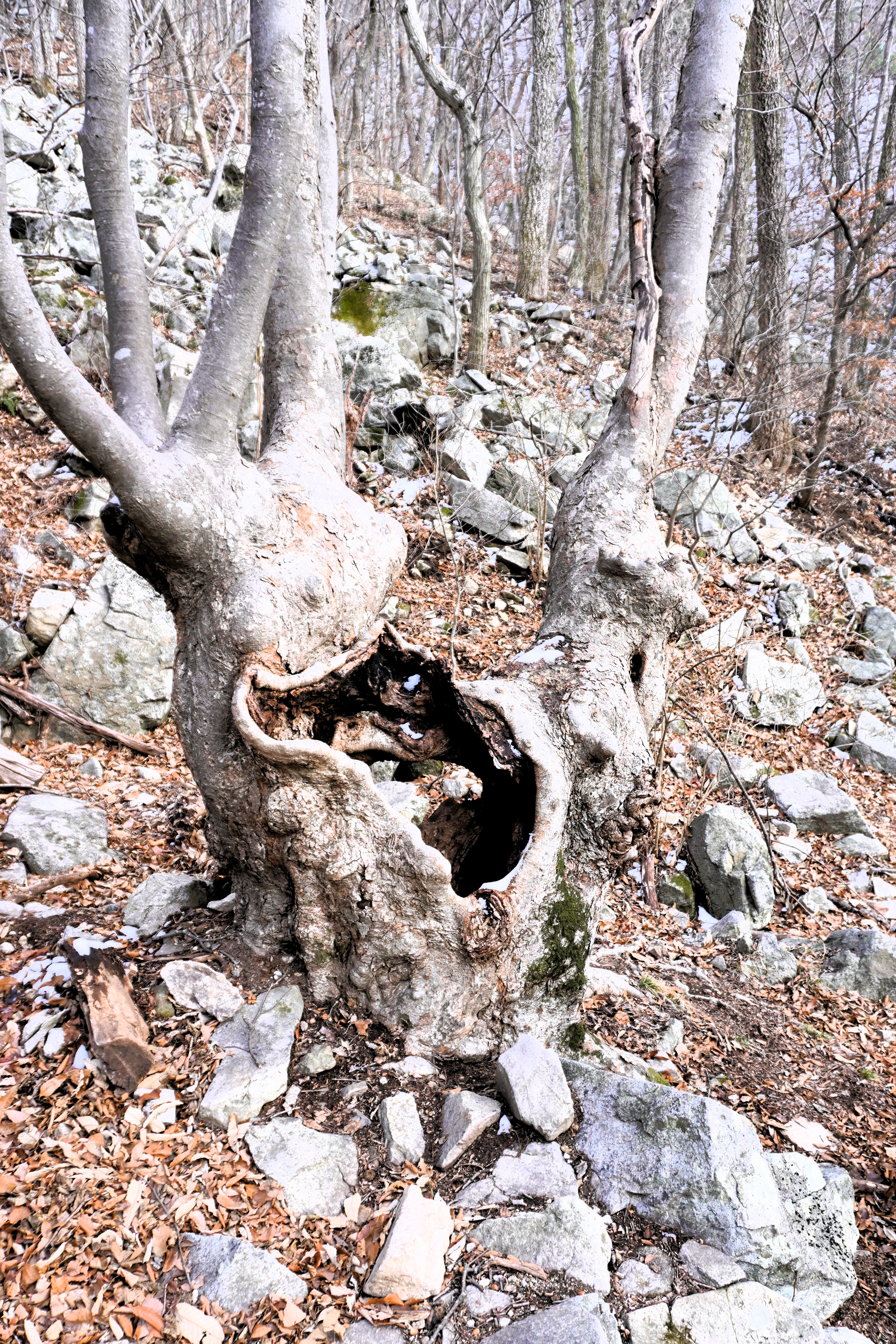 금잔디고개에서 갑사로 이어지는 내리막길은 죄다 돌들을 깔아놓은 너덜길. 게다가 눈도 없어서 아이젠을 벗어 배낭에 걸고 내려갔다.